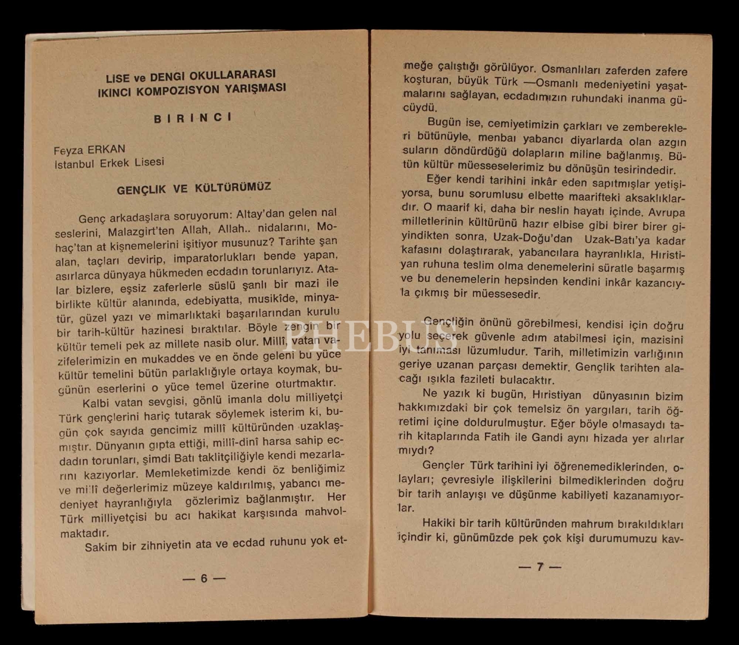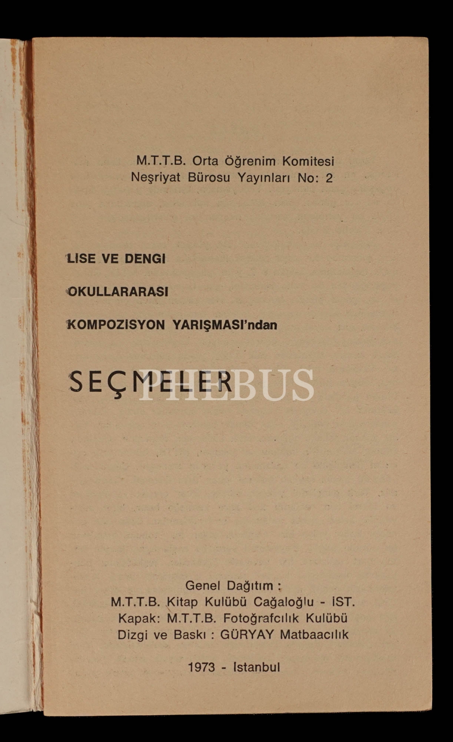 LİSELERARASI KOMPOZİSYON YARIŞMASI´NDAN SEÇMELER, 1973, M.T.T.B. Orta Öğretim Komitesi Neşriyat Bürosu Yayınları No:2, 48 sayfa, 11x19 cm...