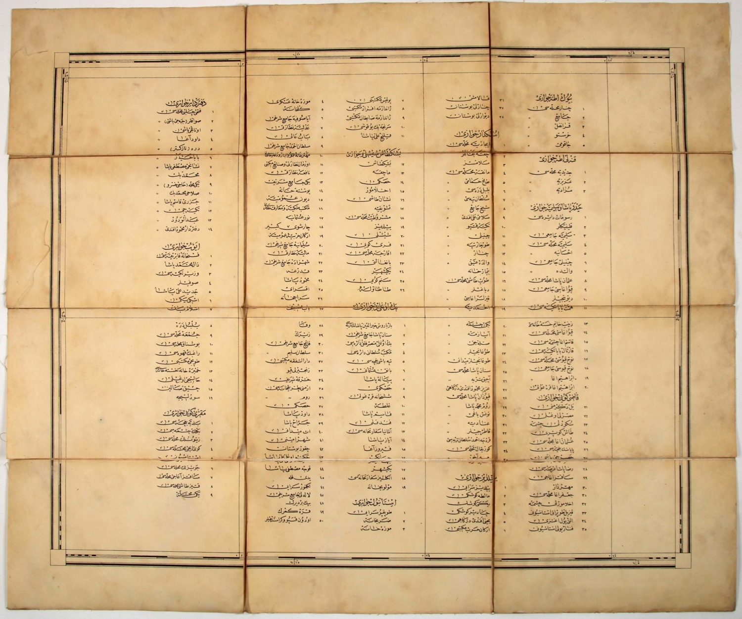 Osmanlıca Büyükada civarı, Yıldız civarı, Beyoğlu civarı, İstanbul civarı, Defterdar civarı, Eyüp civarındaki mahalle isimlerinin olduğu liste, 60x60 cm
