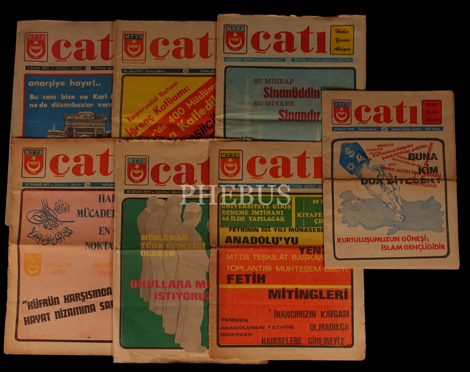 Milliyetçi muhafazakar M.T.T.B. himayesinde 1976-77 yıllarında basılan ÇATI gazetesinin 16, 18, 22, 23, 25, 26, 30 sayıları, 28x40 cm...