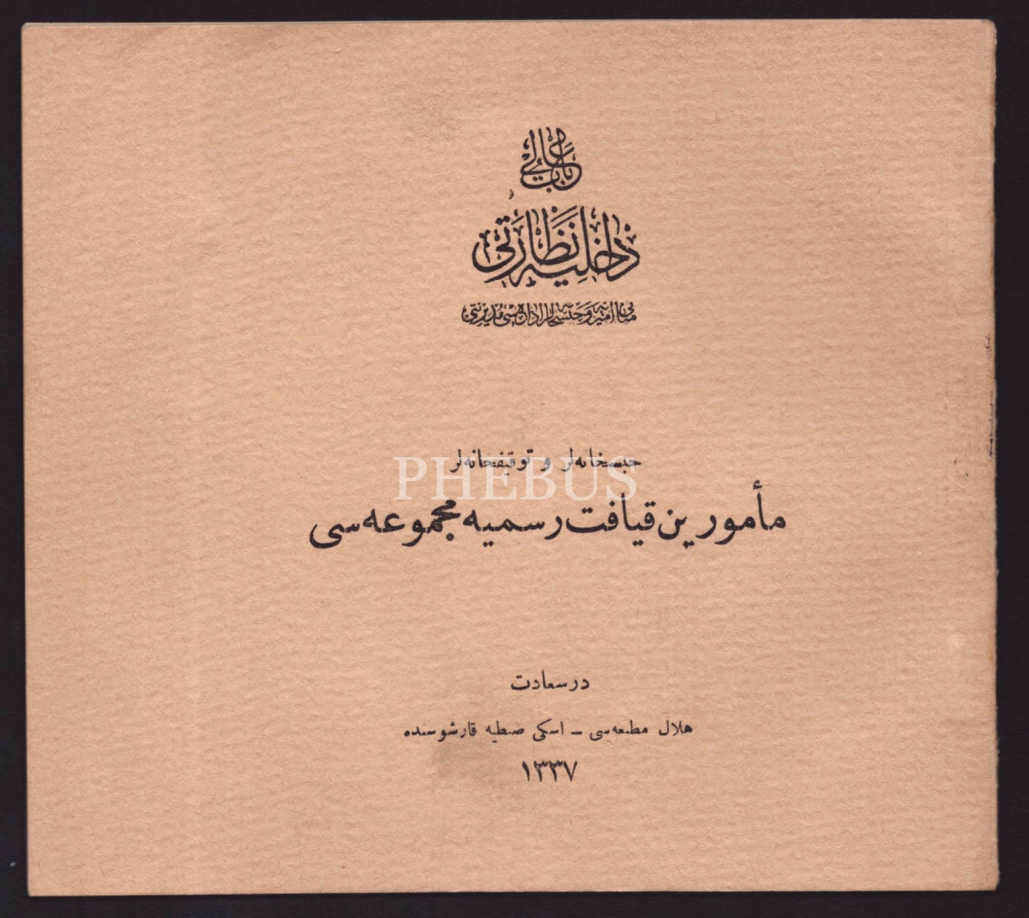 BAB-I ALİ DAHİLİYE NEZARETİ MEBAN-İ EMİRİYE VE HAPİSHANLER MÜDÜRİYETİ HAPİSHANELER VE TEVKİFHANELER MEMUREYN KIYAFET-İ RESMİYE MECMUASI, 1337, Hilal Matbaası, 22 sayfa, 21x18 cm...