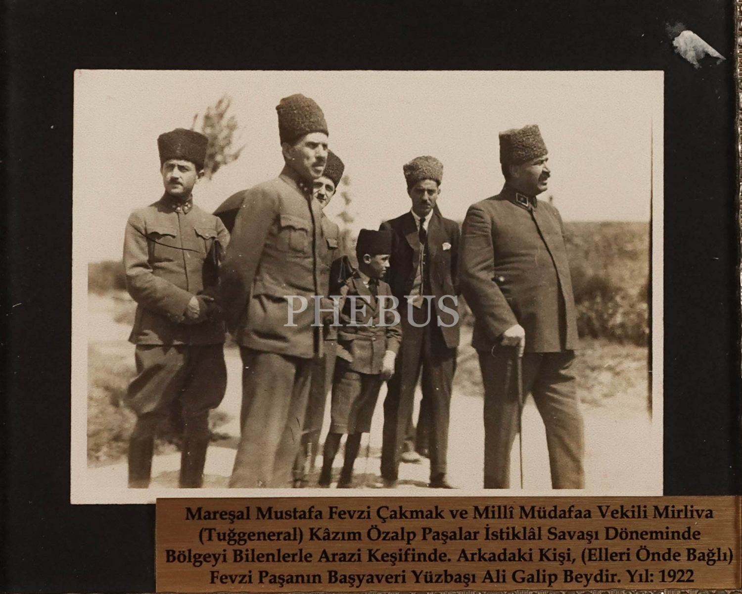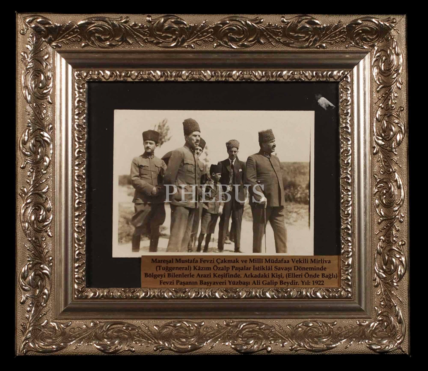 Mareşal Fevzi Çakmak ve Milli Müdafaa Vekili Mirliva Kazım Özalp Paşalar, İstiklal Savaşı döneminde bölgeyi bilenlerle arazi keşfinde, çerçevesiyle birlikte 35x31 cm...