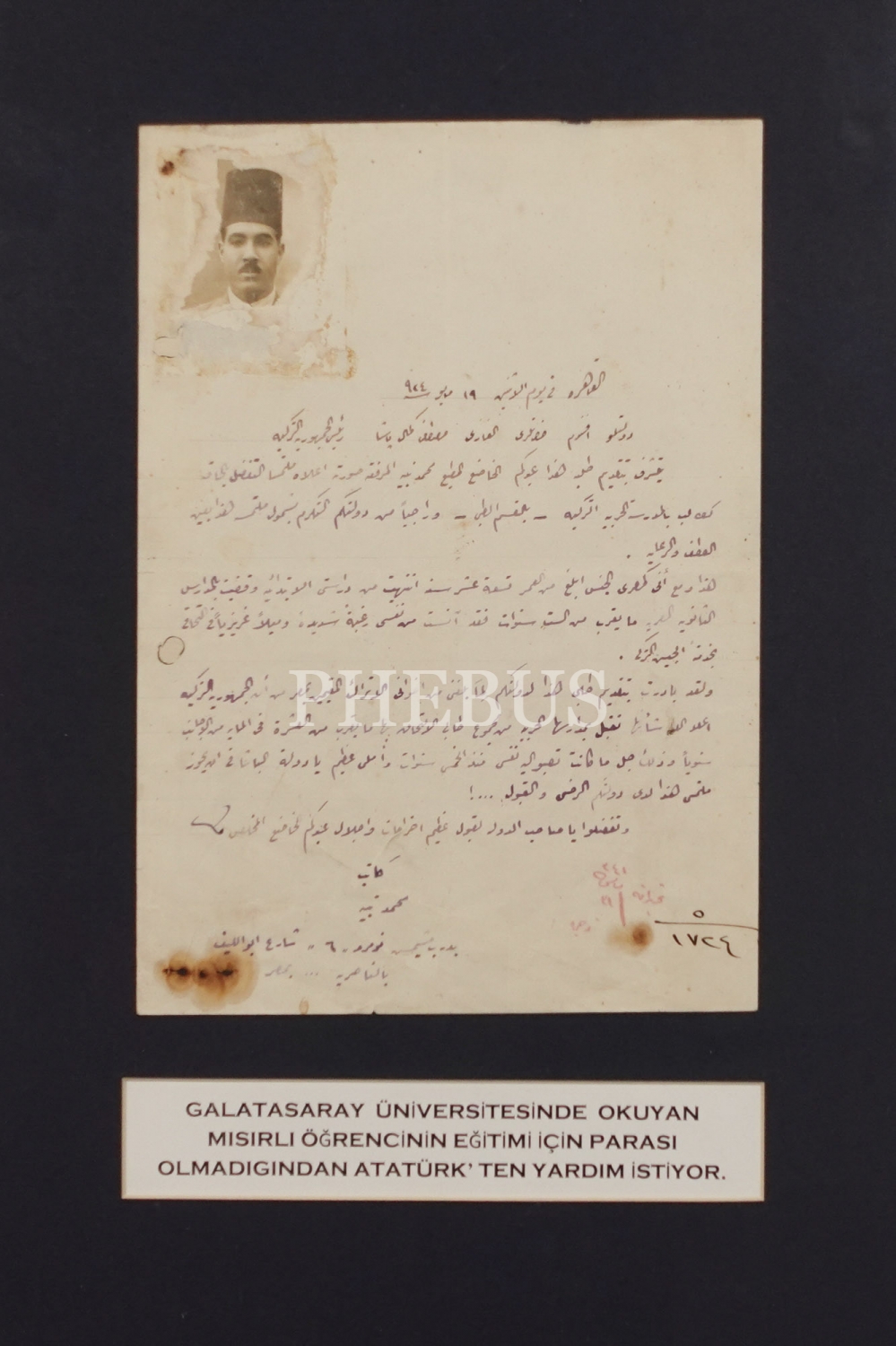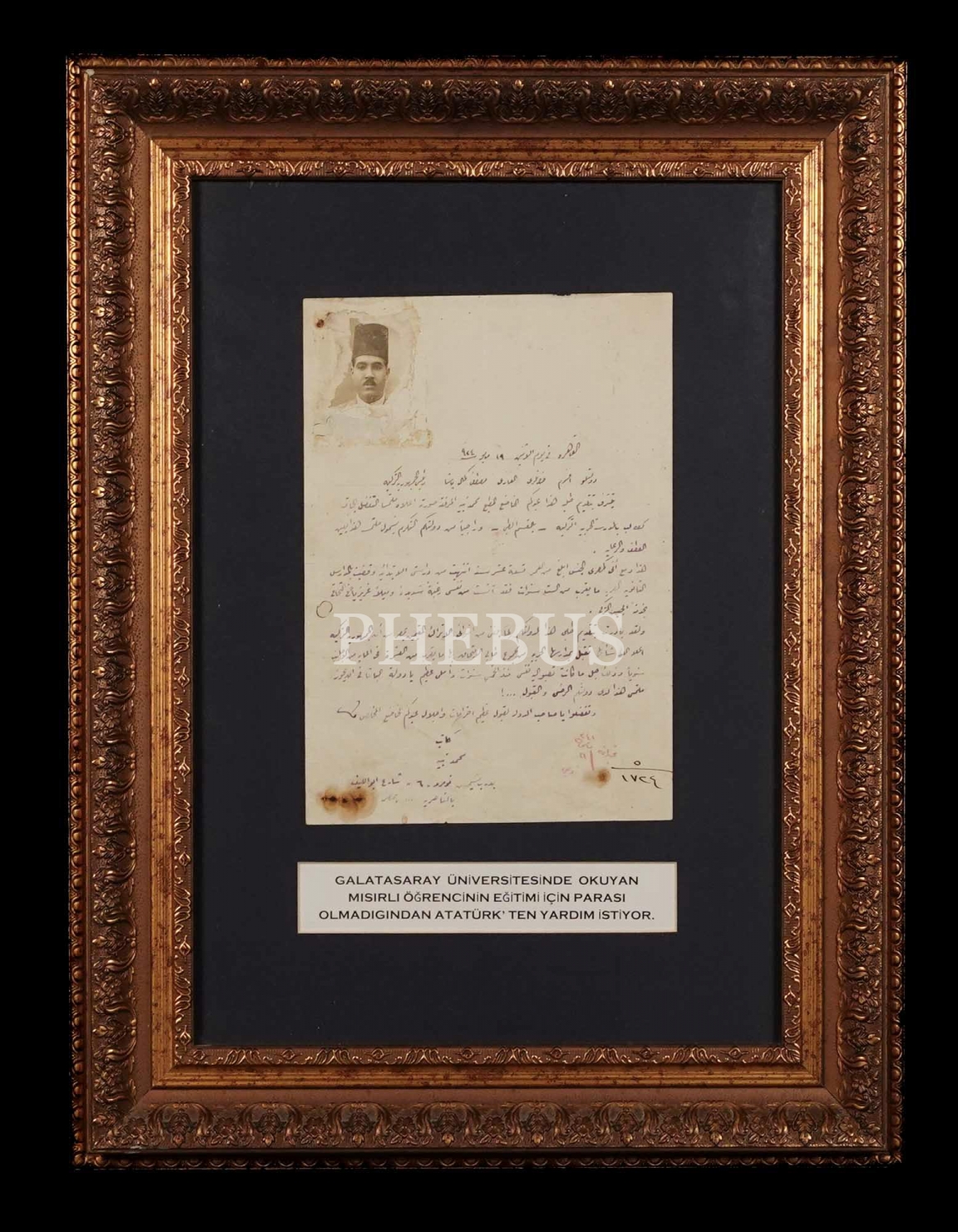 Galatasaray Lisesi´nde eğitim gören ve eğitimi için yeterli parayı bulamayan öğrencinin Mustafa Kemal Atatürk´ten yardım istediği mektubu, çerçevesiyle birlikte 38x50 cm...