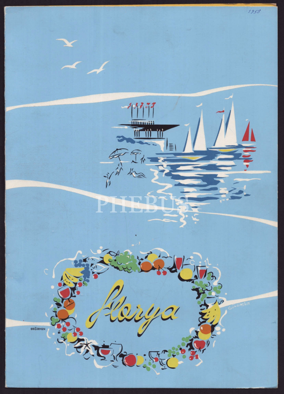 Gülümser Aral imzalı, Türkiye Turizm Bankası Turistik Tesisleri´nden Boğaziçi Lokanta ve Gazinosu için hazırlanmış kartonet, serigrafi baskı, 45x31 cm...