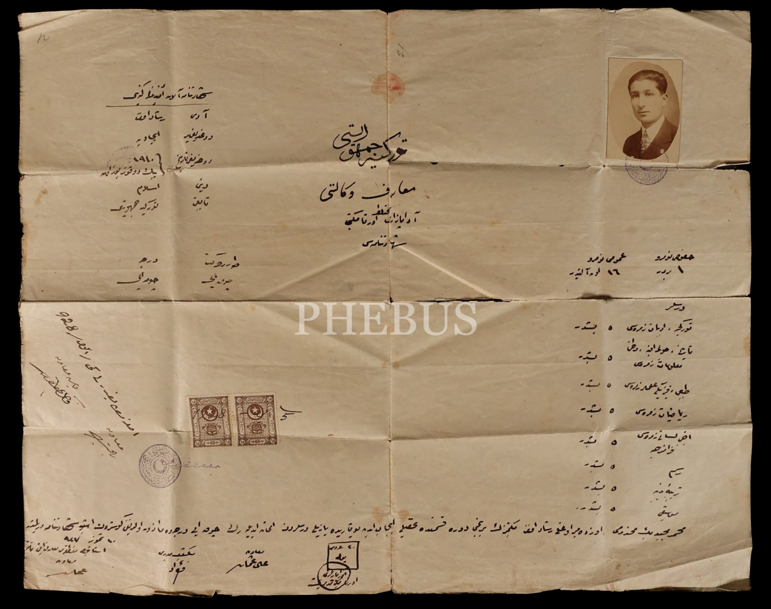 Türkiye Cumhuriyeti Maarif Vekaleti Adapazarı Muhtelit (Karma) Orta Mektebi´nden mezun olan Reşad Efendi´nin el ile hazırlanmış diploması, 1927, 42x34 cm...