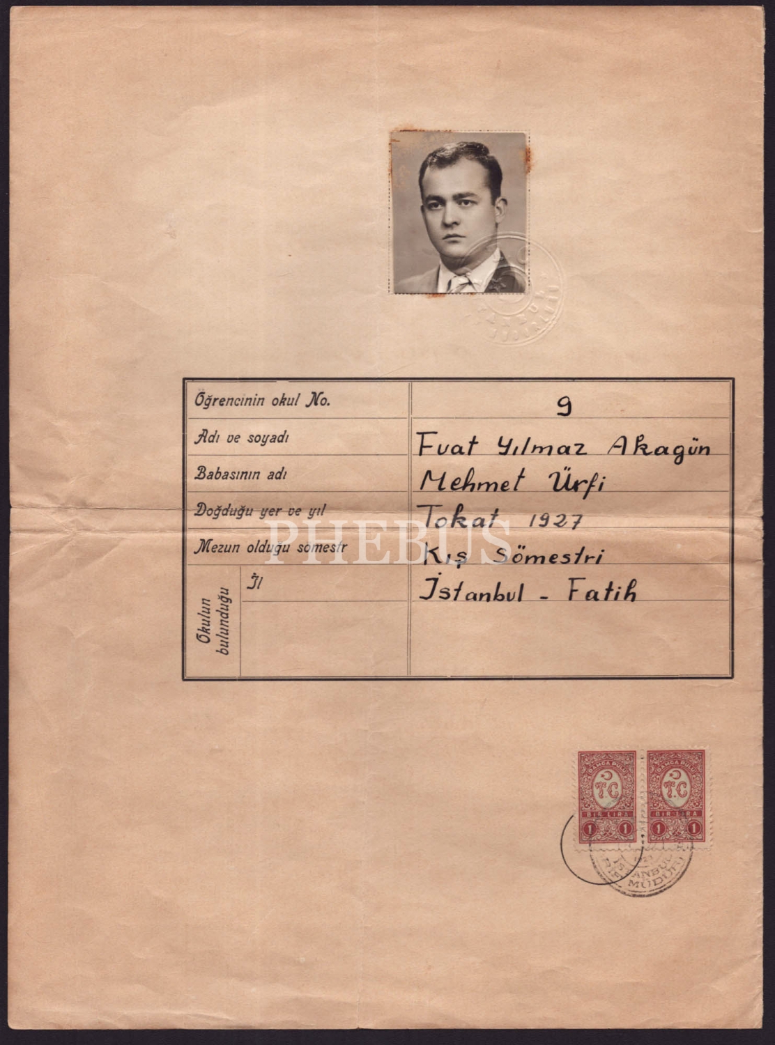 İstanbul Özel Gazetecilik Okulu´ndan mezun olan F. Yılmaz Akagün´ün gazetecilik diploması, 1954, 50x33 cm...