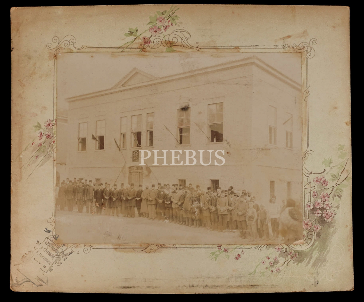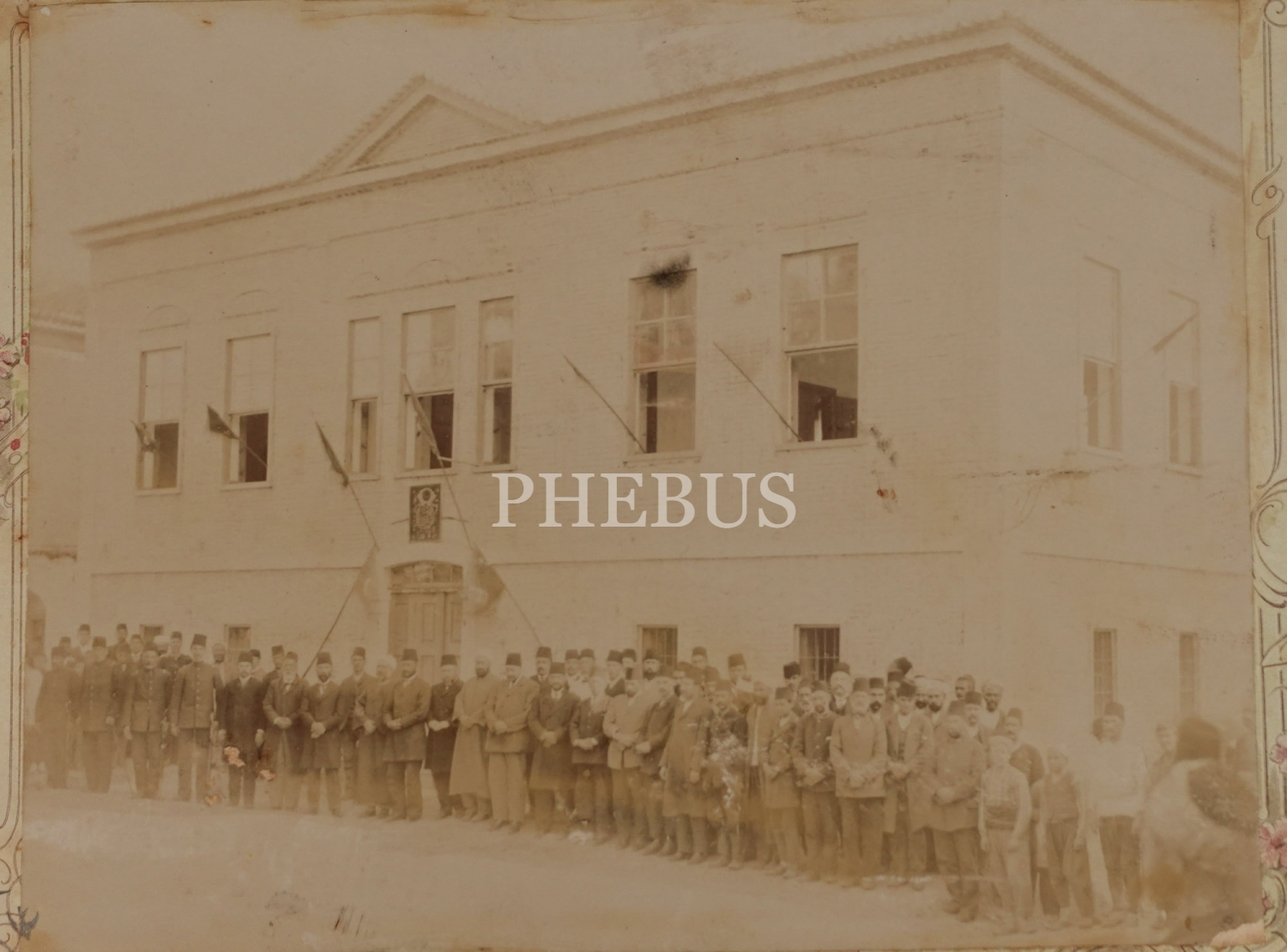 Osmanlı Devlet armasının bulunduğu bina önünde poz veren askerler, devlet erkanı ve halk, 36x30 cm...