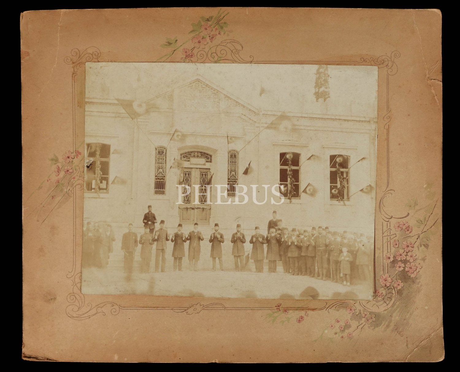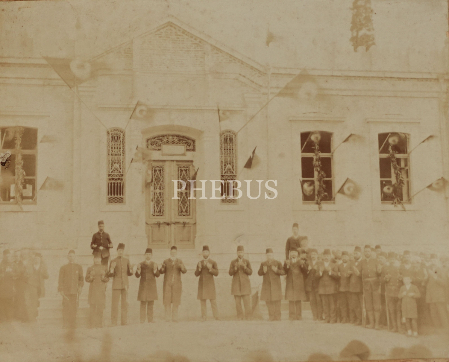 Önünde durdukları binanın açılış merasiminde dua eden askerler, devlet erkanı ve halkın görüldüğü fotoğraf, 36x30 cm...