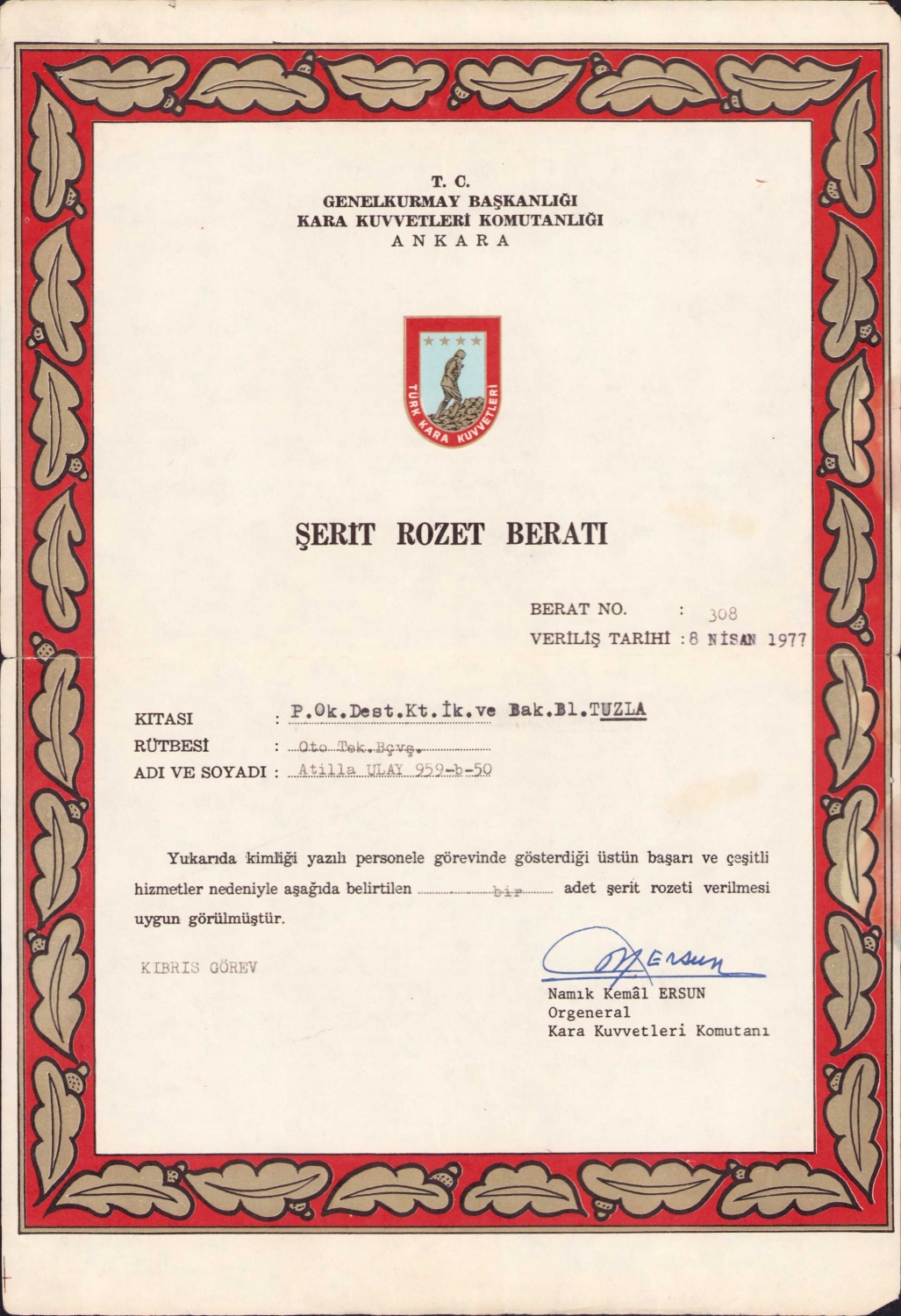 Kara Kuvvetleri Komutablığı Şerit Rozet Beratı, 1977, 20x28 cm
