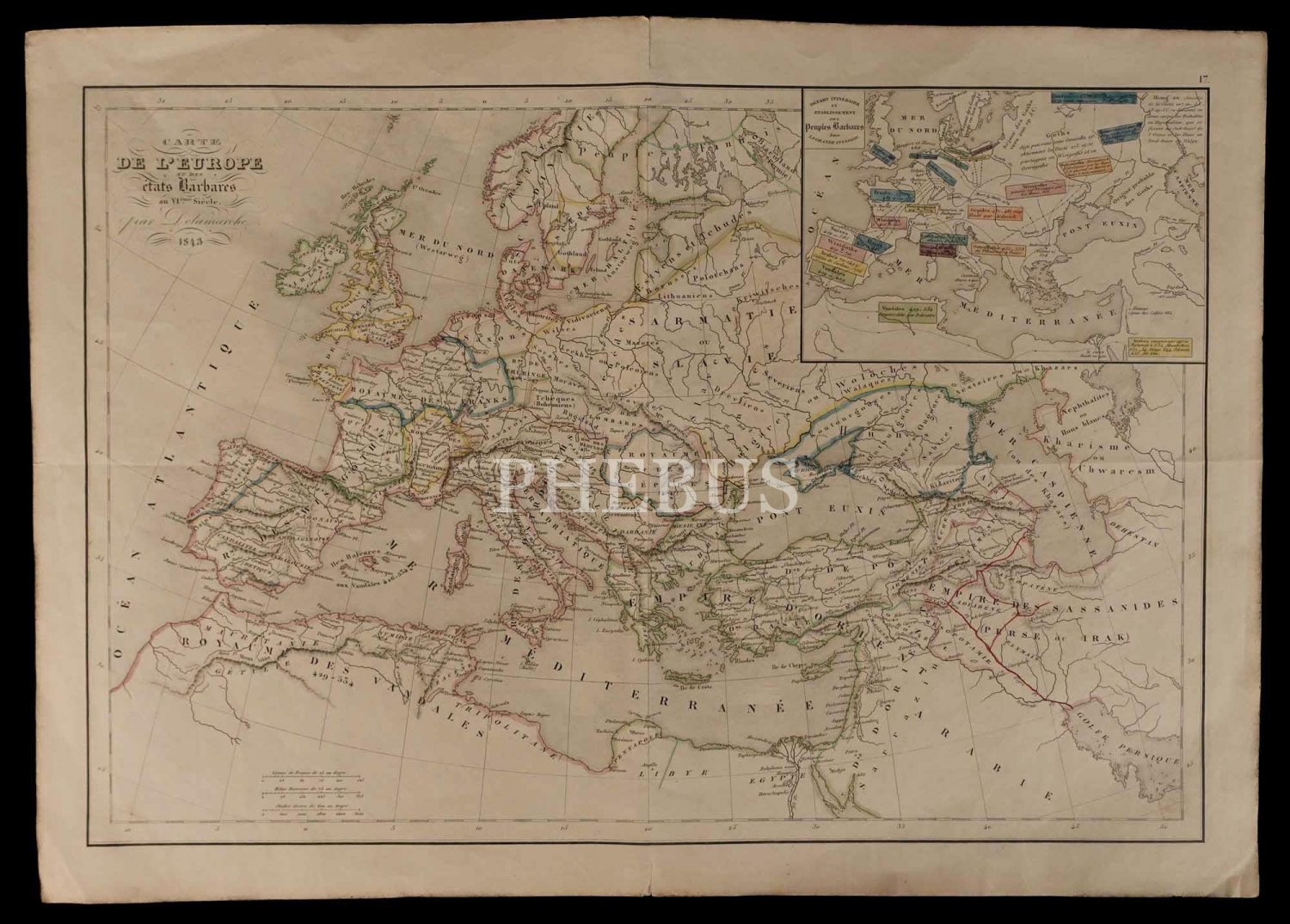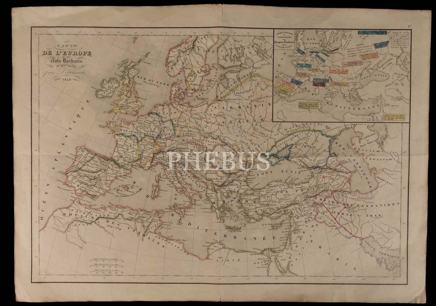 "Büyük İstila"sırasında Avrupa, Orta Doğu ve Akdeniz bölgesini ve 6. yüzyıldaki barbar devletleri gösteren harita, Delamarche, 47x34 cm...