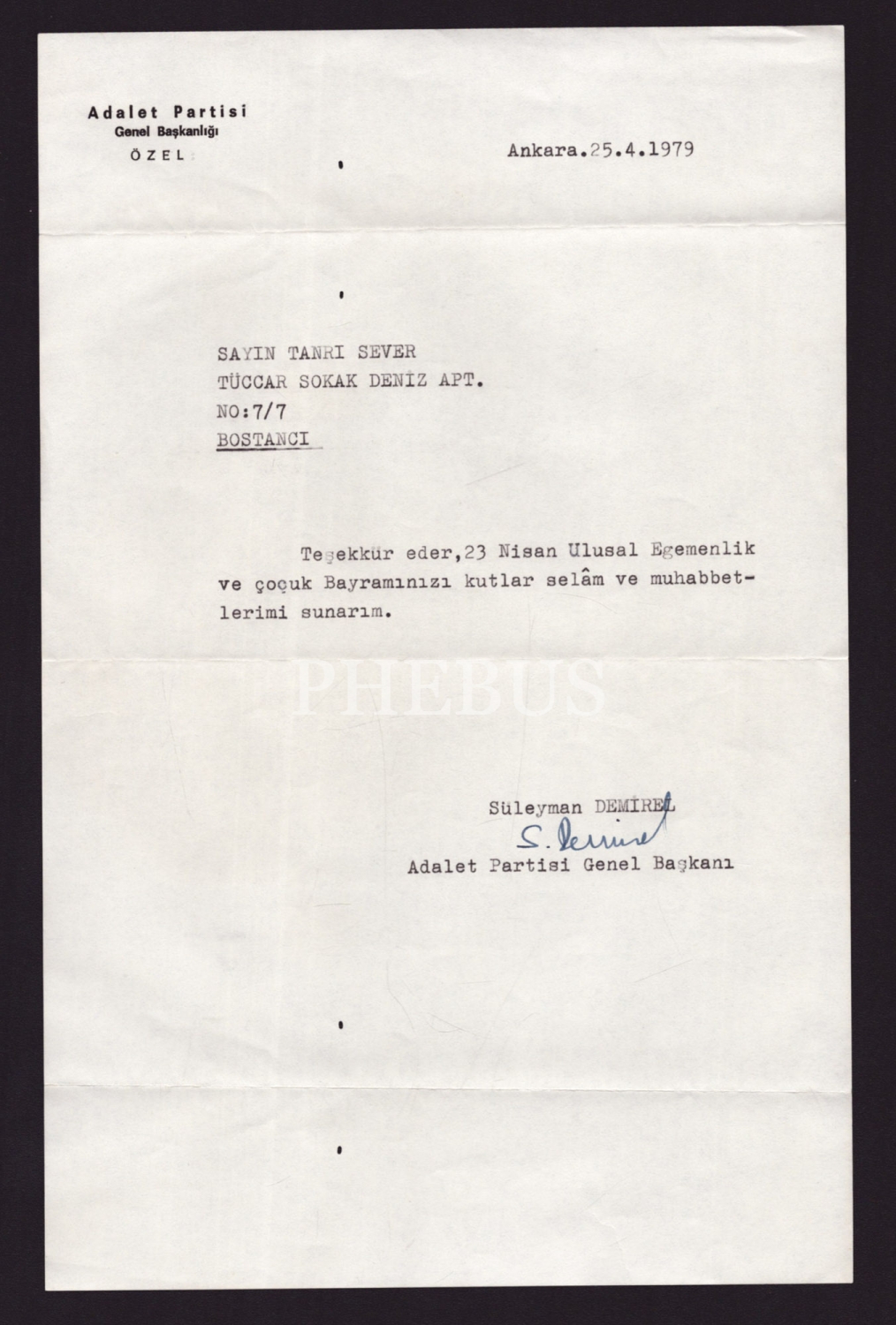 Adalet Partisi Genel Başkanlığı antetli, Süleyman Demirel´in, Naci Tanrısever´in 23 Nisan bayramını kutlamak için yazdığı ve ıslak imzasının yer aldığı mektup, 25 Nisan 1979, 18x25 cm...