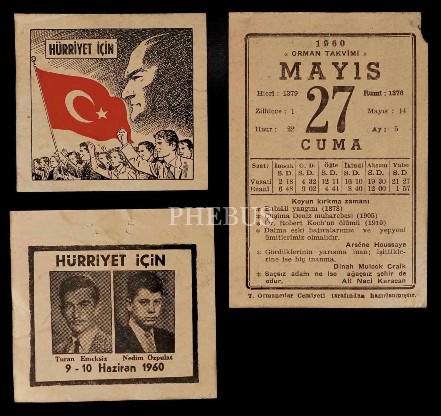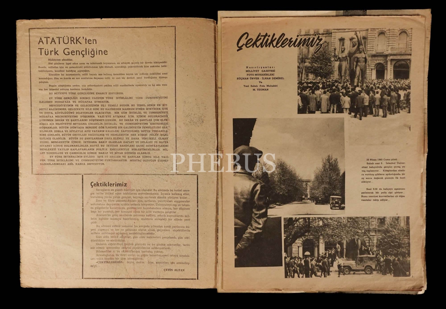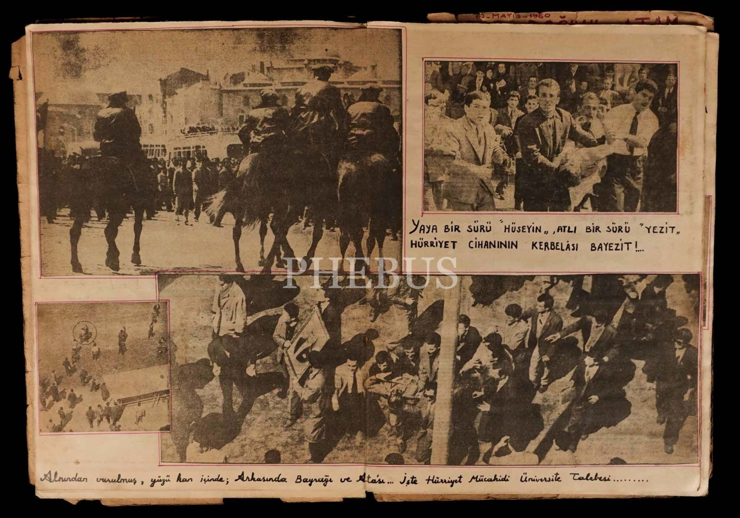 28 Nisan 1960 sabahı İstanbul Üniversitesi bahçesinde düzenlenen protesto mitingi sırasında öldürülen iki üniversite öğrencisinin fotoğrafına yer verilen, "Hürriyet İçin" başlıklı 2 adet gazete kupürü...