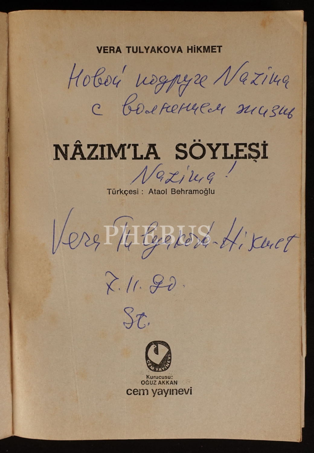 Nazım Hikmet´in eşi Vera Tulyakova Hikmet, Kiril alfabesi ile kaleme aldığı ithafıyla imzalamıştır.