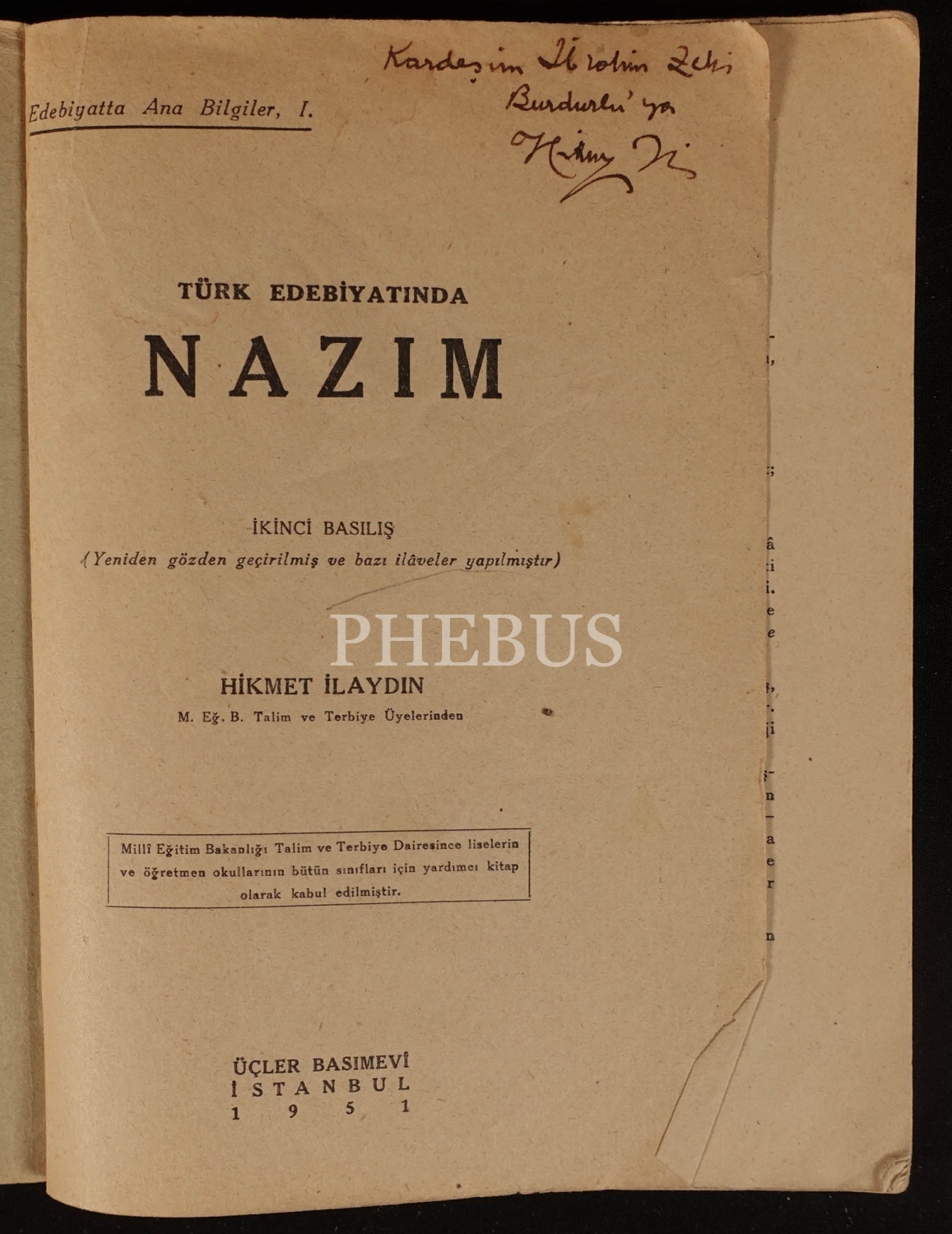 TÜRK EDEBİYATINDA NAZIM, Hikmet İlaydın, 1951, Üçler Basımevi, 158 sayfa, 14x20 cm...