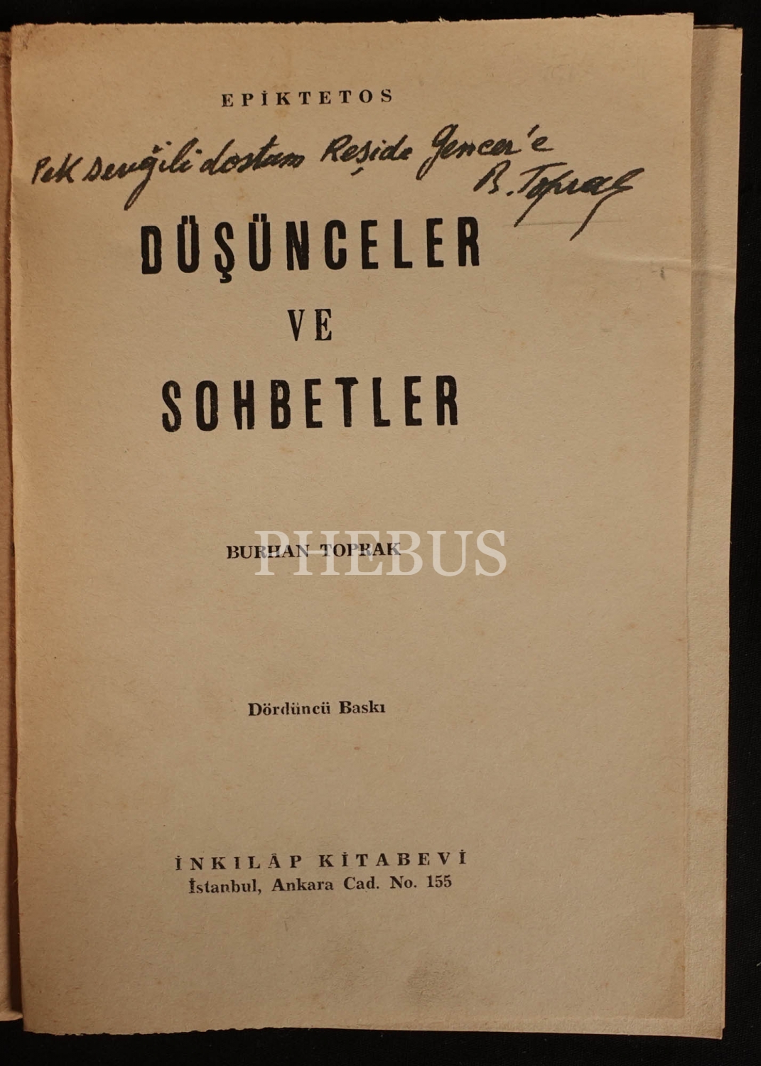 DÜŞÜNCELER VE SOHBETLER, Epiktetos, (çeviren: Burhan Toprak), 1958, İnkılap Kitabevi, 87 sayfa, 14x20 cm...