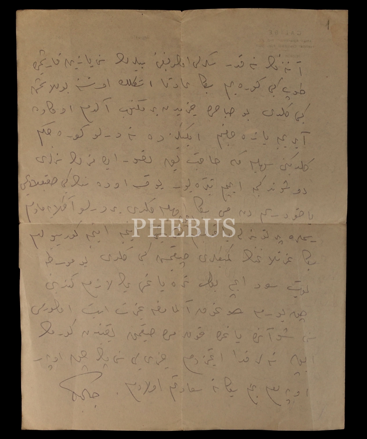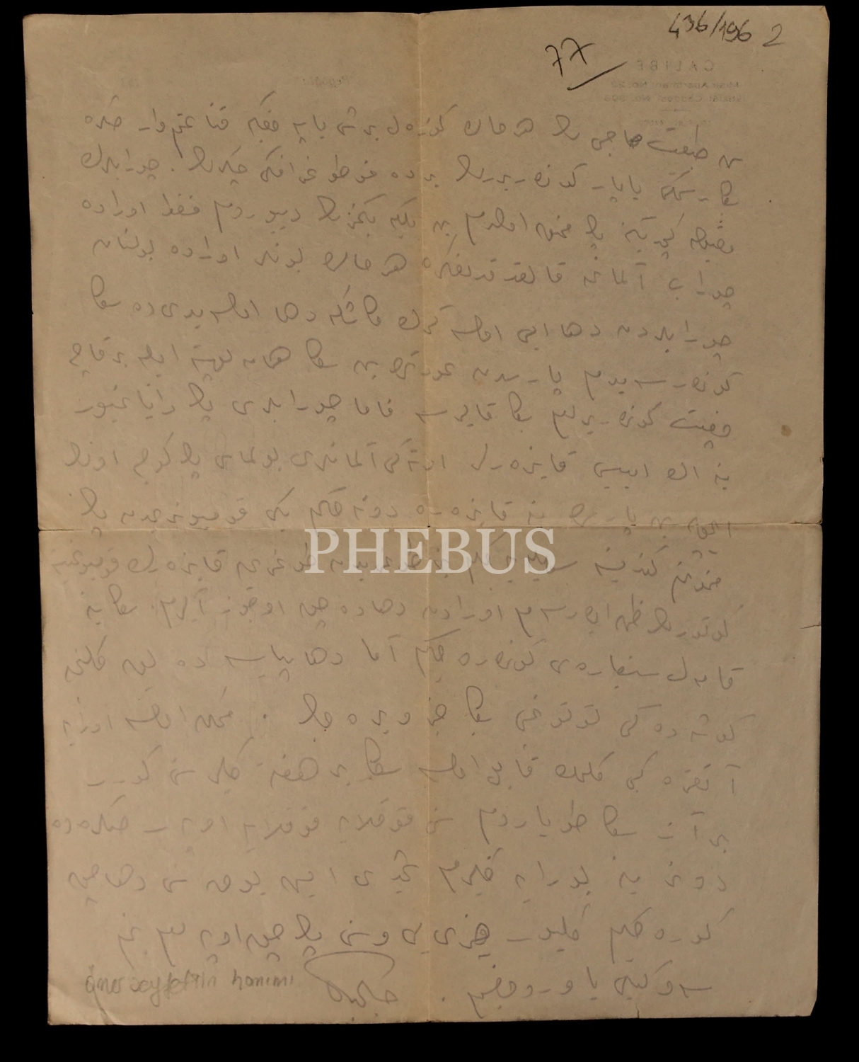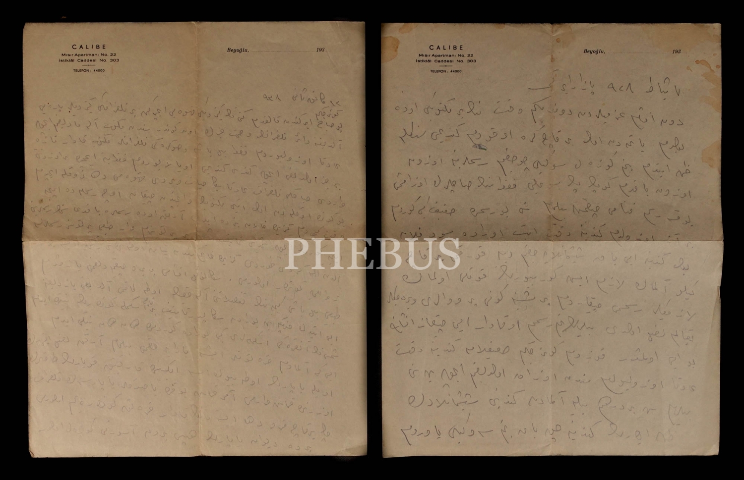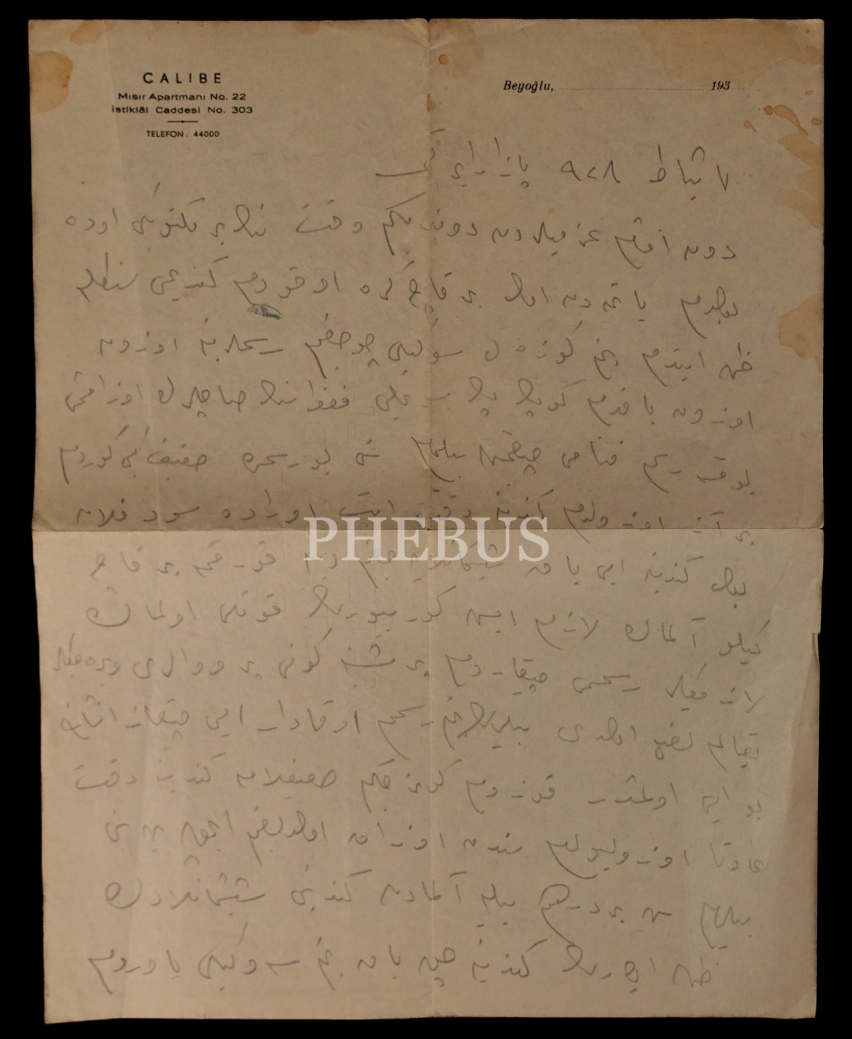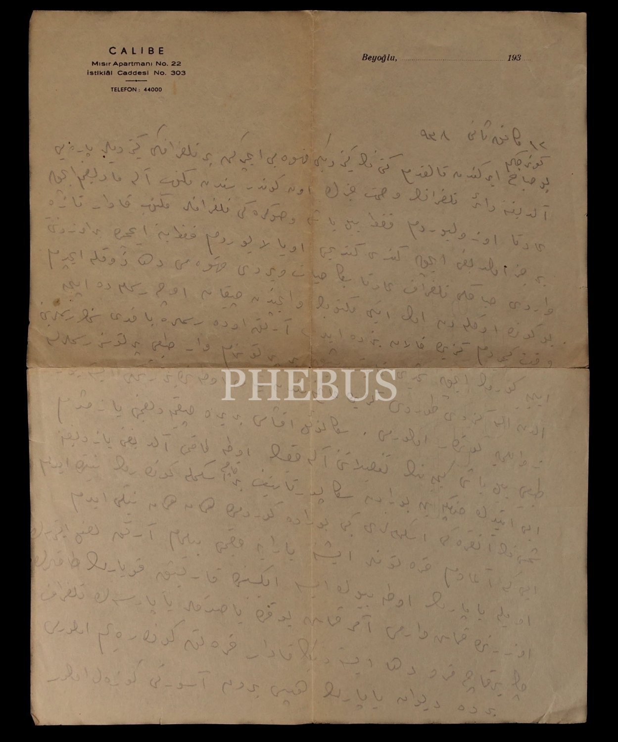 Ömer Seyfettin'in eşi, Erken Cumhuriyet döneminin meşhur terzisi Calibe Hanım'ın Mısır Apartmanı'nda bulunan terzihanesinin antetli kâğıtlarına kaleme aldığı iki yaprak, dört sayfalık el yazısı mektup, 23x30 cm...
