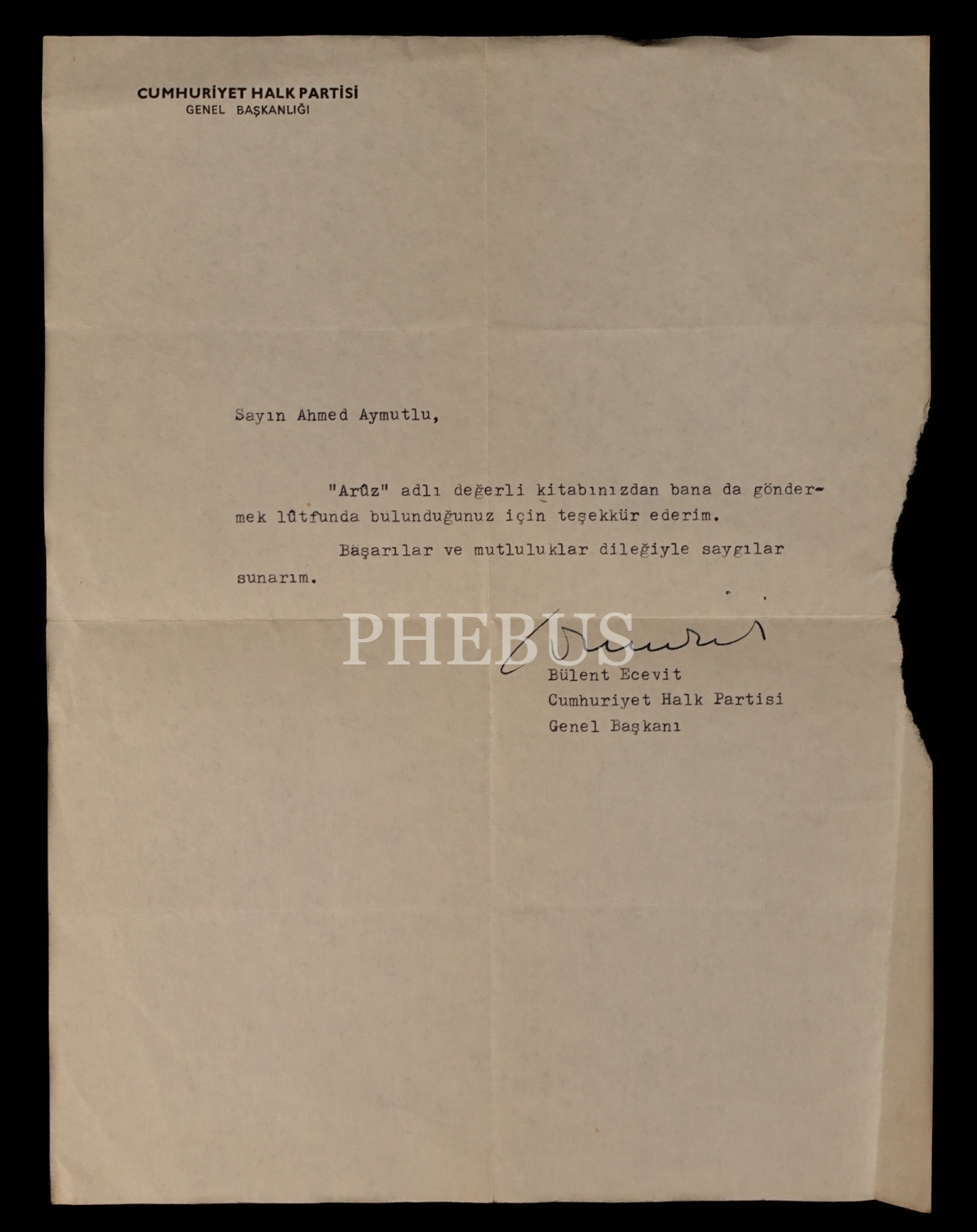 Bülent Ecevit'ten Ahmet Aymutlu'ya gönderilmiş ıslak imzalı daktilo teşekkür mektubu, 21x29 cm...
