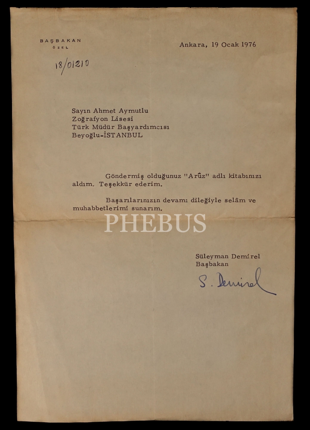 "Göndermiş olduğunuz 'Arûz' adlı kitabınızı aldım. Teşekkür ederim. Başarılarınızın devamı dileğiyle selâm ve muhabbetlerimi sunarım. Süleyman Demirel Başbakan"