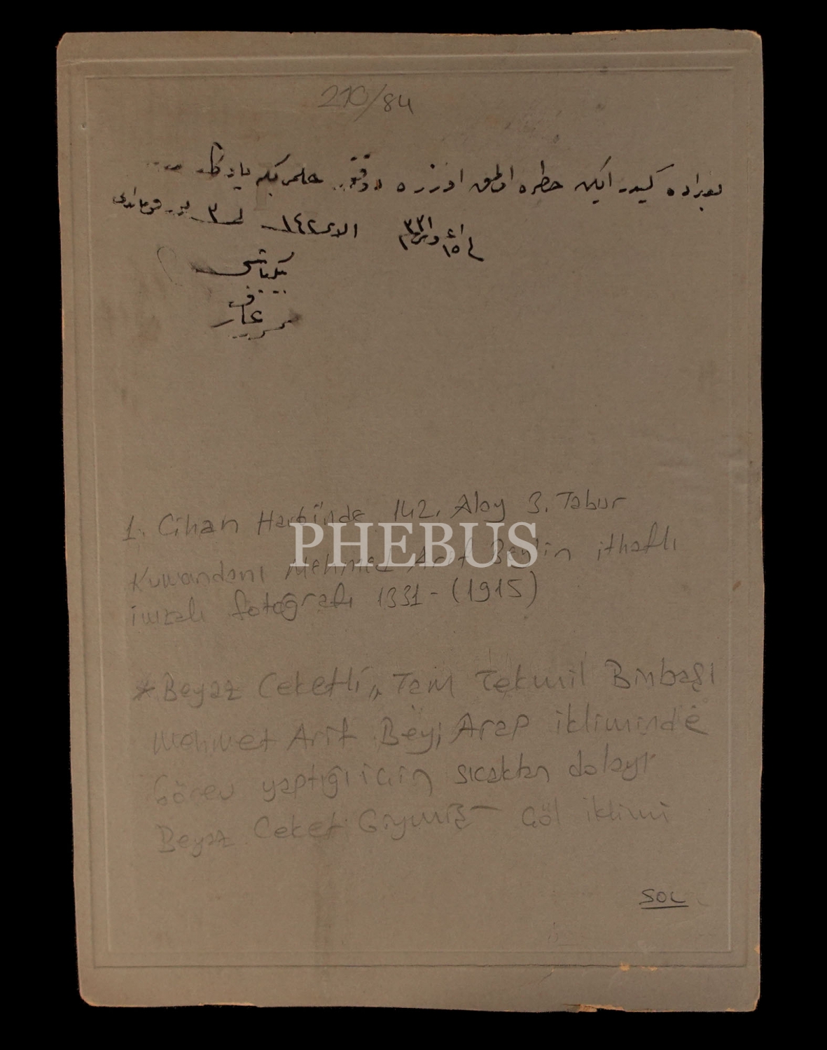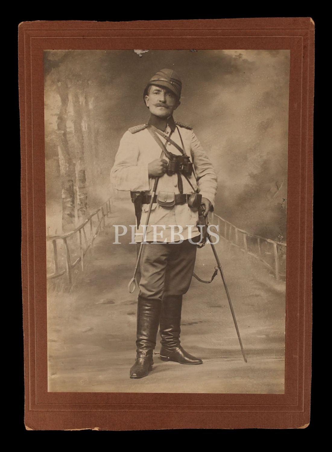 Cihan Harbi´nde 142. Alay 3. Tabur Kumandanı olarak görev yapan Binbaşı Mehmed Arif Bey´in, beyaz ceketli, tam teçhizatlı üniformasıyla aldırdığı stüdyo hatıra fotoğrafı, 19x26 cm...