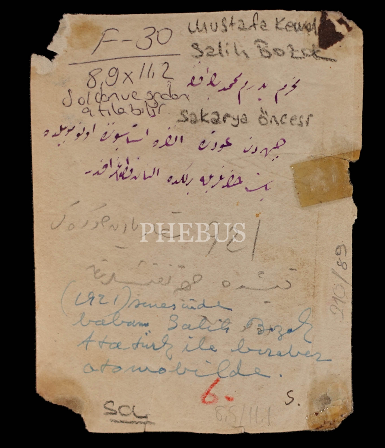 Fotoğrafın arka yüzünde Osmanlıca, "Muhterem pederim Mehmed Beyefendi cepheden avdetten Ankara İstasyonu´nda otomobilde Paşa Hazretleri ile birlikte alınan fotoğrafıdır." notu yer almaktadır.