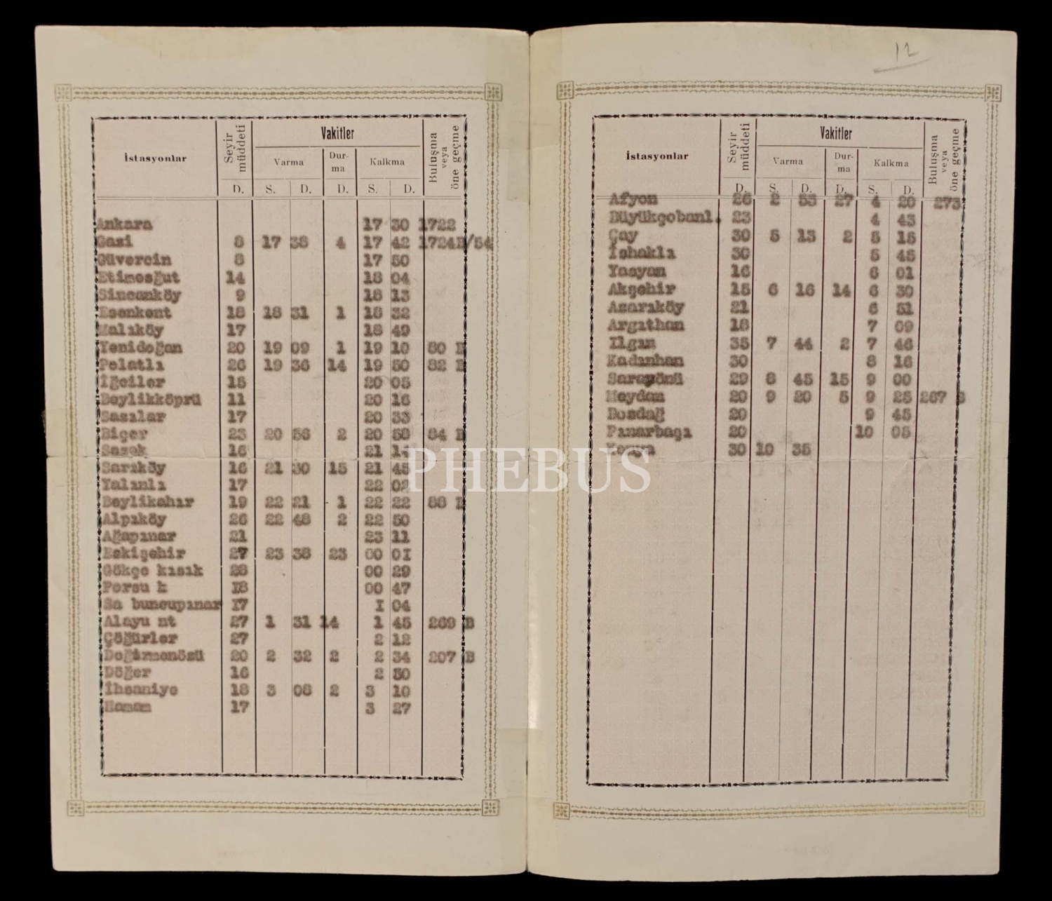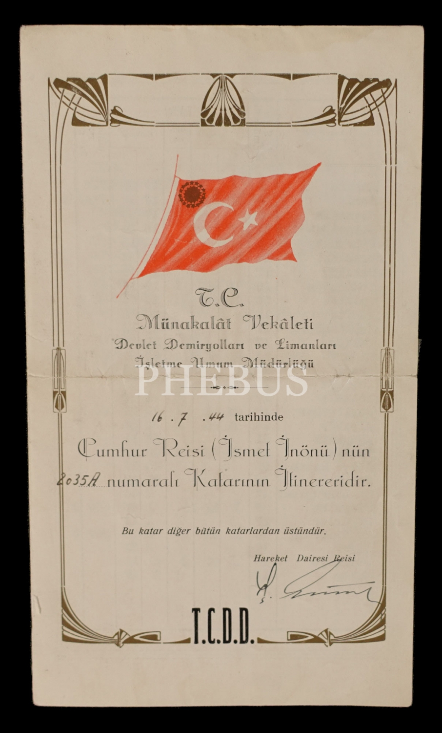 Cumhurbaşkanı İsmet İnönü´nün, 16 Temmuz 1944 tarihinde "8035A" numaralı katar (tren) ile Ankara´dan Konya´ya gerçekleştirdiği seyahatinin tarifnamesi, 24x21 cm...