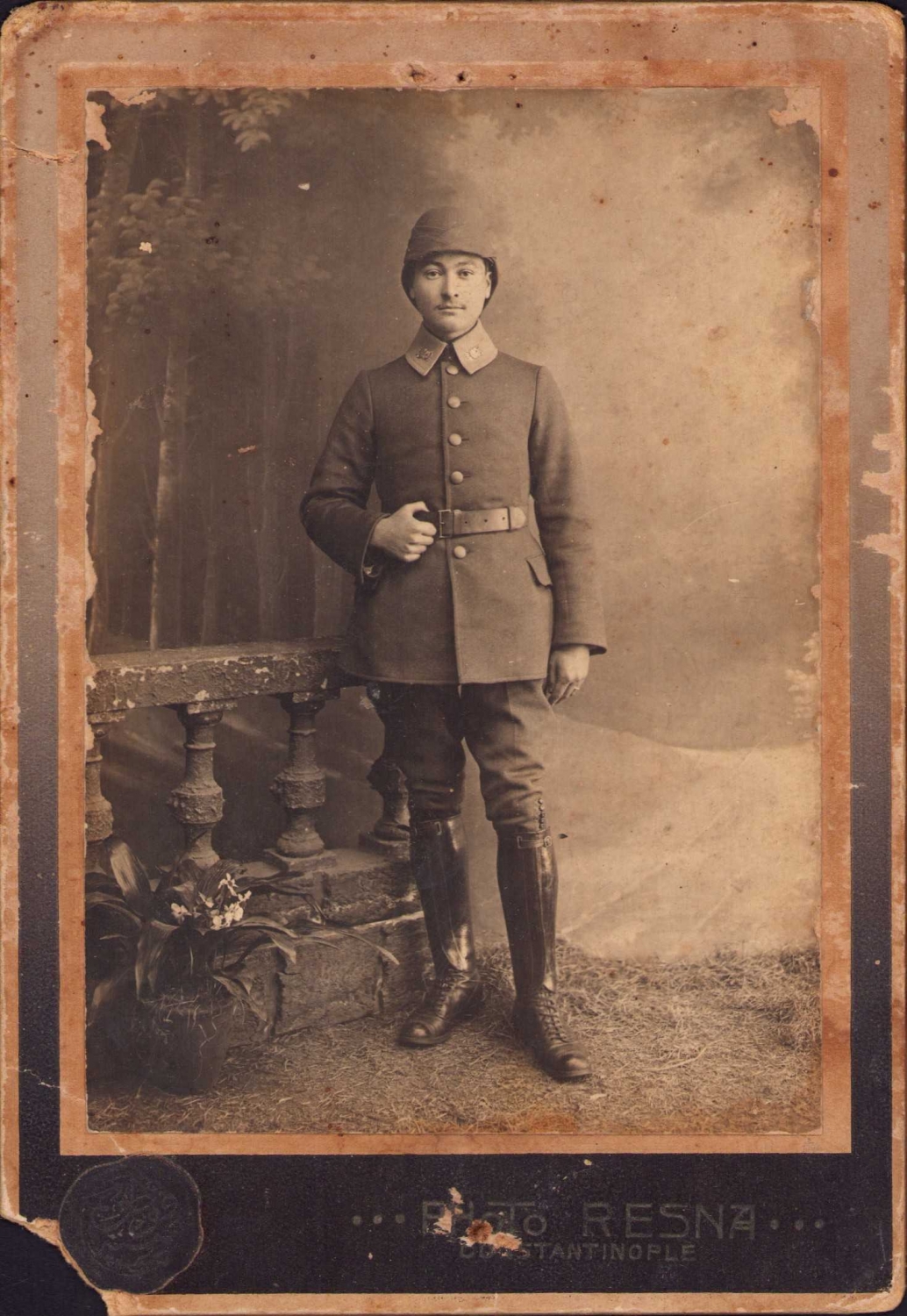 Photo Resna kabin fotoğrafı, 1. Cihan Harbi, kabalaklı asker, kenarları yıpranmış, 10x17 cm