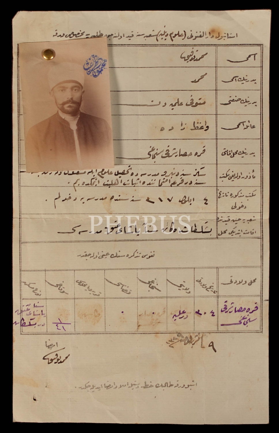 Osmanlı Darülfünun Ulum-ı Diniyye Şubesi´ne kayıt olan Mehmed Tevfik Efendi´nin kayıt evrakı, 17x27 cm...