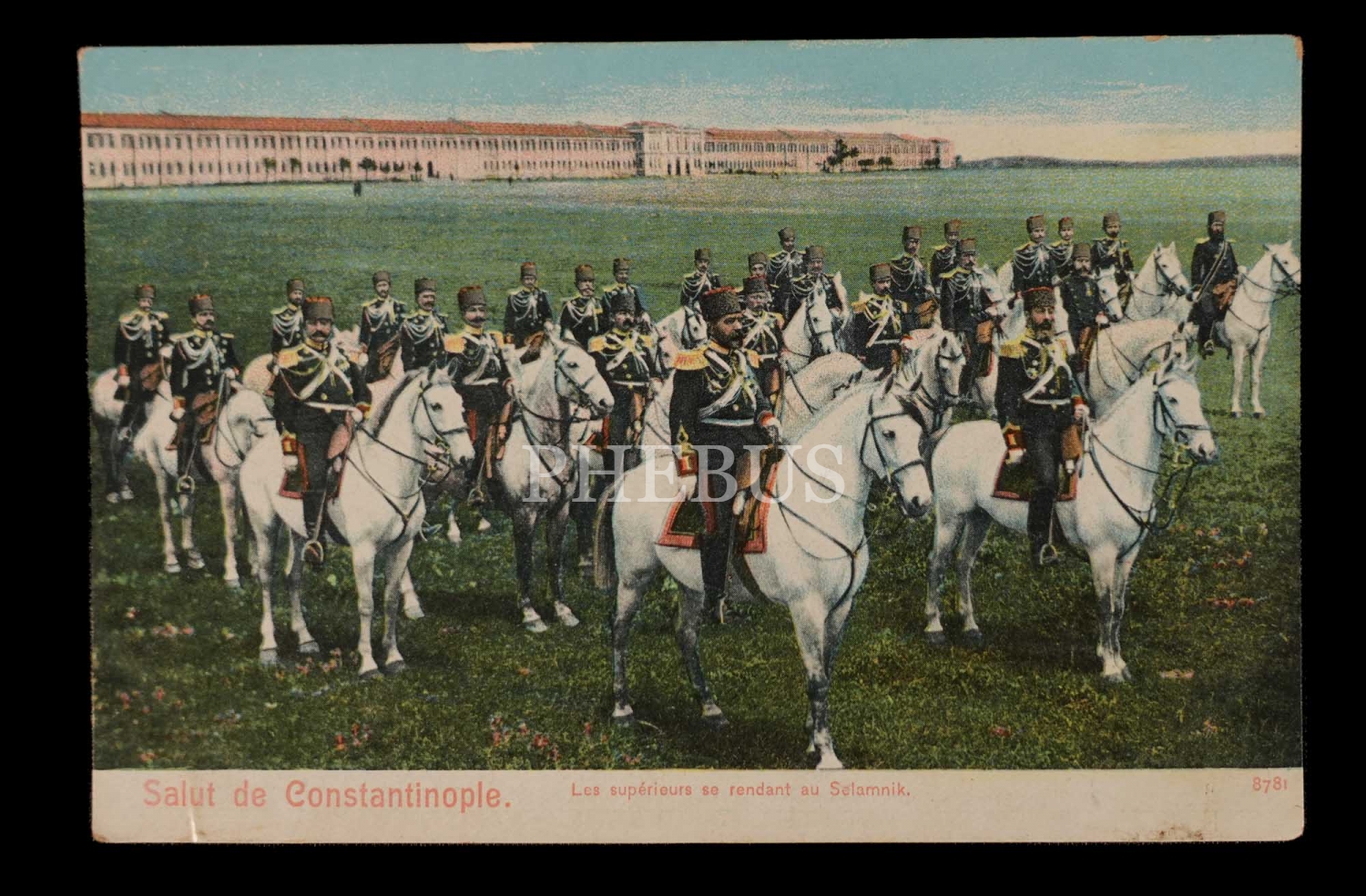 Türk süvari birlikleri selamlık merasiminde, "Les superieurs se redant au Selamnik", 14x9 cm...