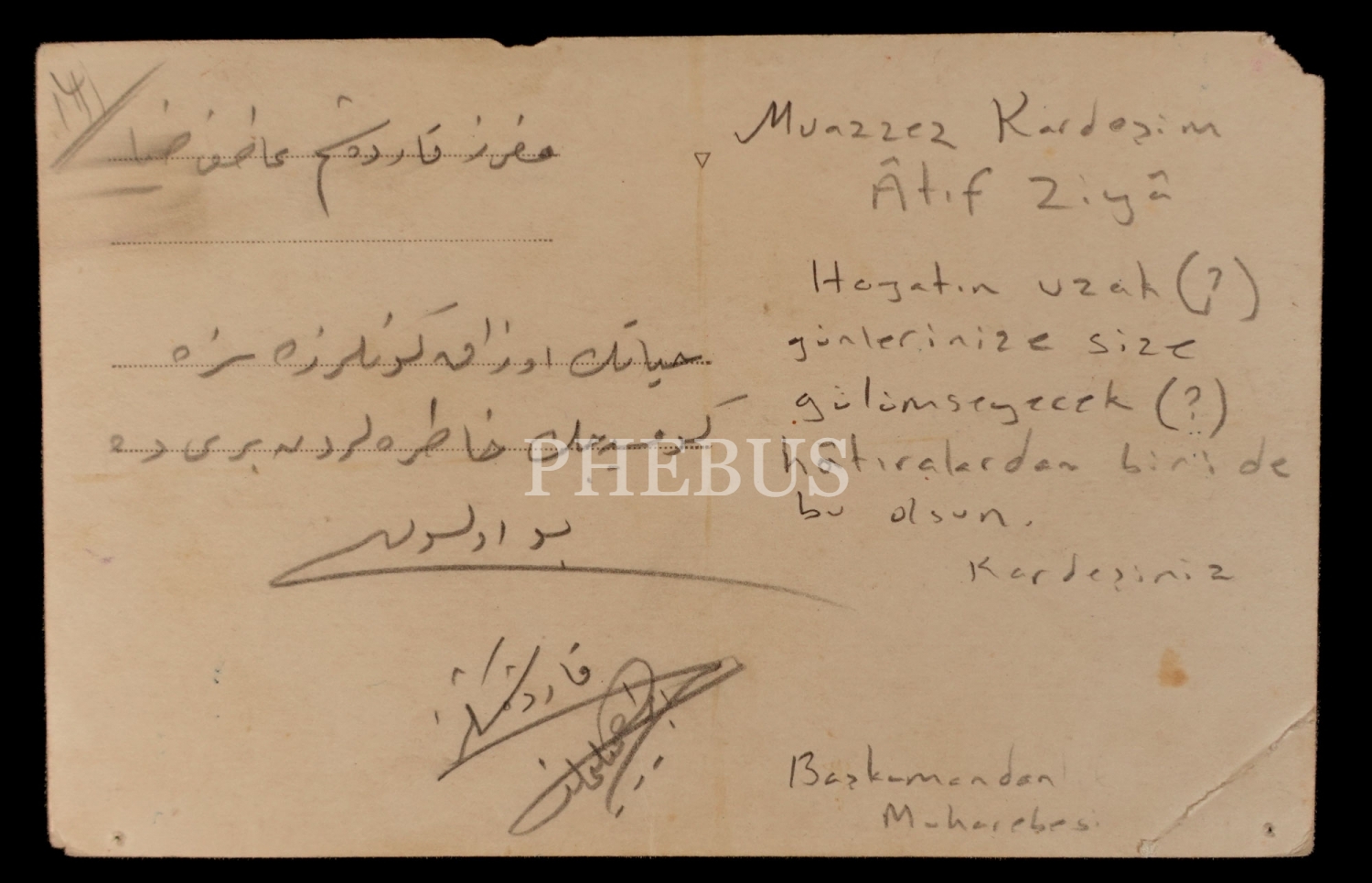Kartpostalın arka yüzünde, "Muazzez kardeşim Atıf Ziya, hayatın uzak günlerinde size gülümseyecek hatıralardan biri de bu olsun" yazılıdır.