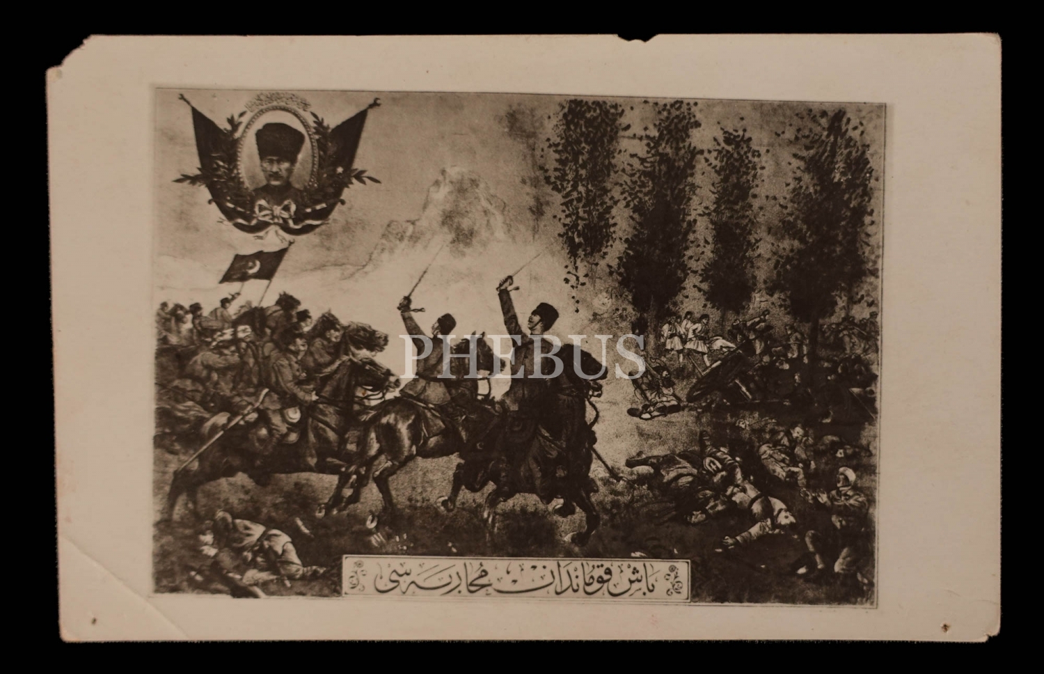 Mustafa Kemal Atatürk fotoğrafı´nın yer aldığı ve Başkumandanlık Muharebesi´nin illüstre edildiği kartpostal, "Başkumandan Muharebesi", 14x9 cm...