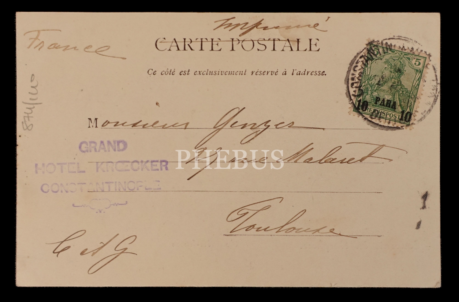 Arka yüzünde, "Grand Hotel Krocker - Constantinople" kaşesi yer almaktadır.