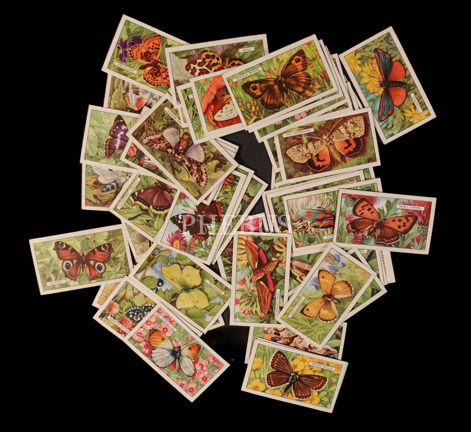 "Gallaher Ltd." markasının yayımladığı, 19. yüzyıl başlarında sigara paketlerinin içinden çıkan ve kelebekleri konu alan 48 adet sigara kağıdı, "Butterflies an Moths", 4x7 cm...