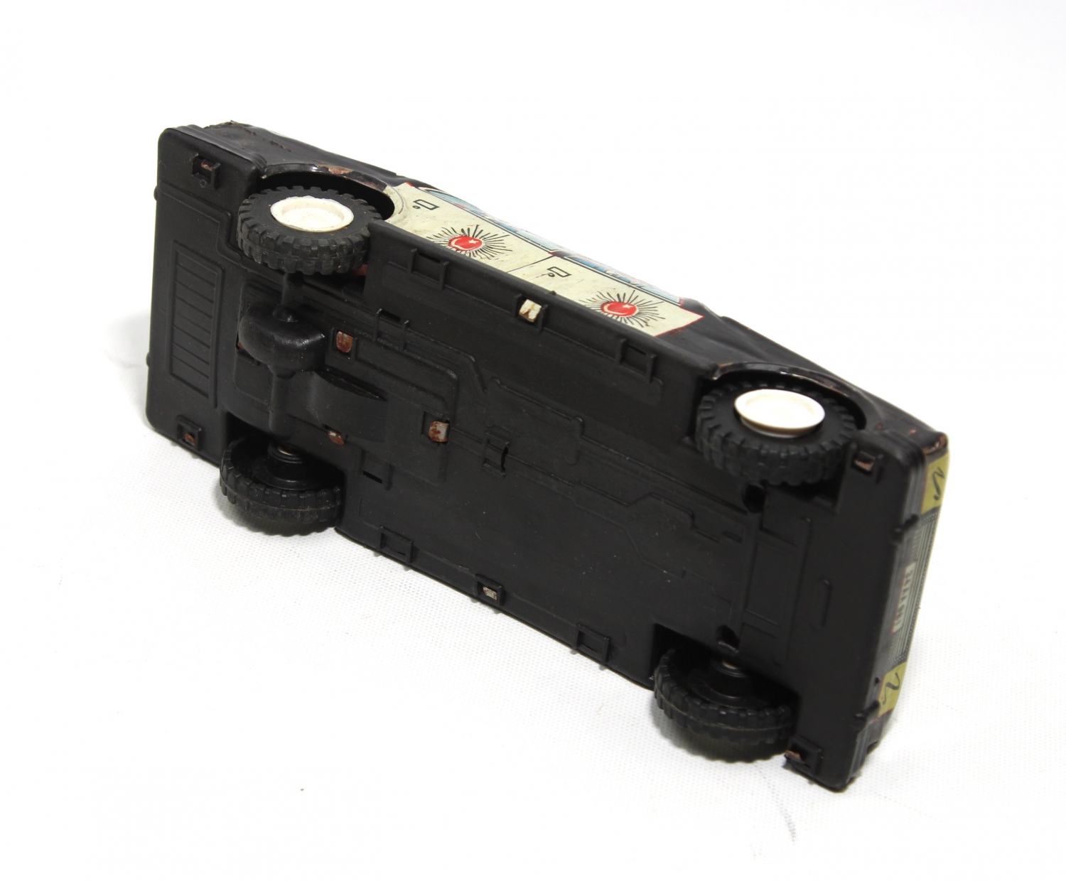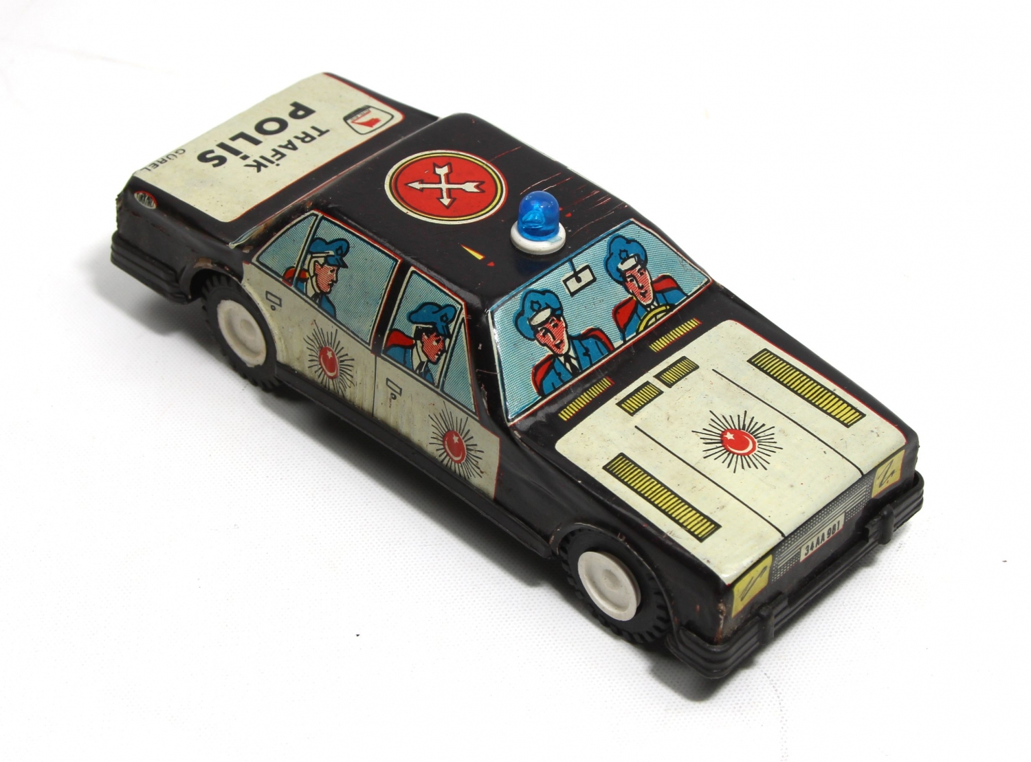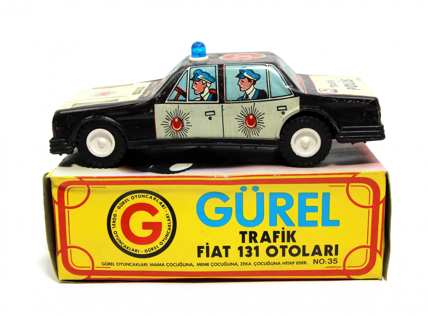 Yerli oyuncak, Gürel marka, FIAT 131 model, Trafik Polisi arabası, sürtmeli, 1980'ler, kendi kutusunda, kutu ve araba çil kondisyonda, 18,5x7cm