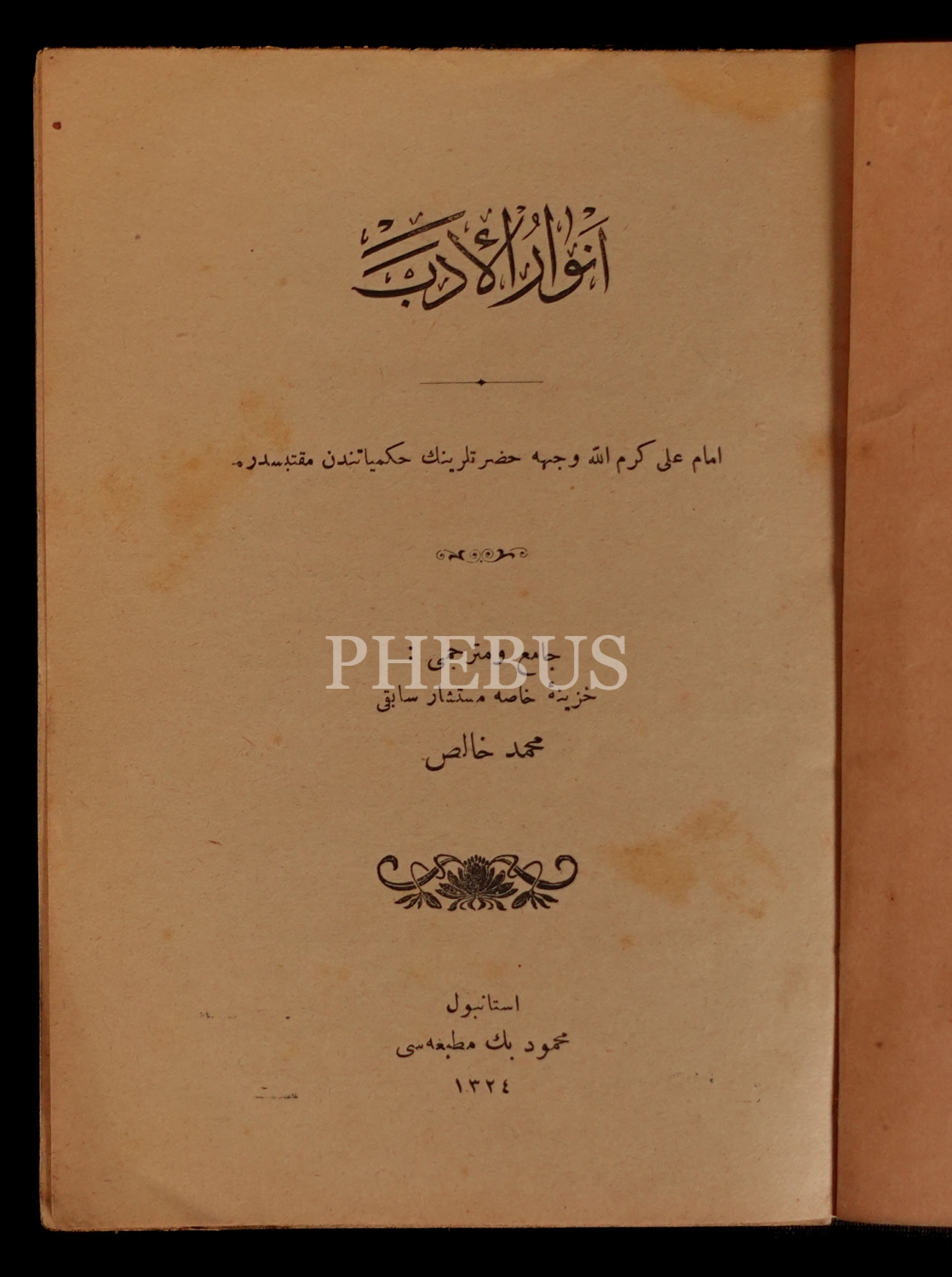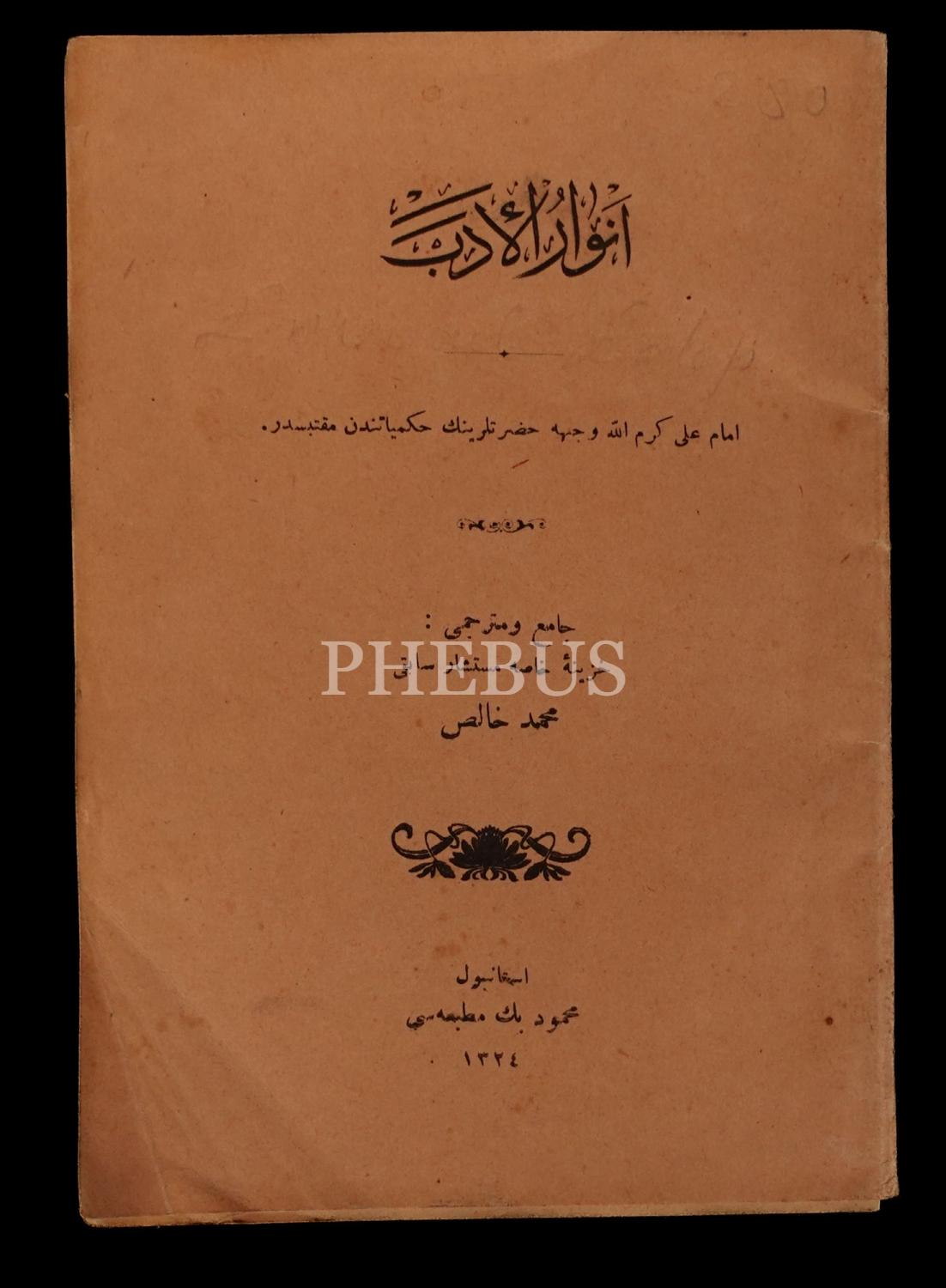 ENVARÜ´L-EDEB, İmam Ali b. ebu Talib, (çeviren: Mehmed Halis), 1324, Mahmud Bey Matbaası, 52 sayfa, 12x18 cm...