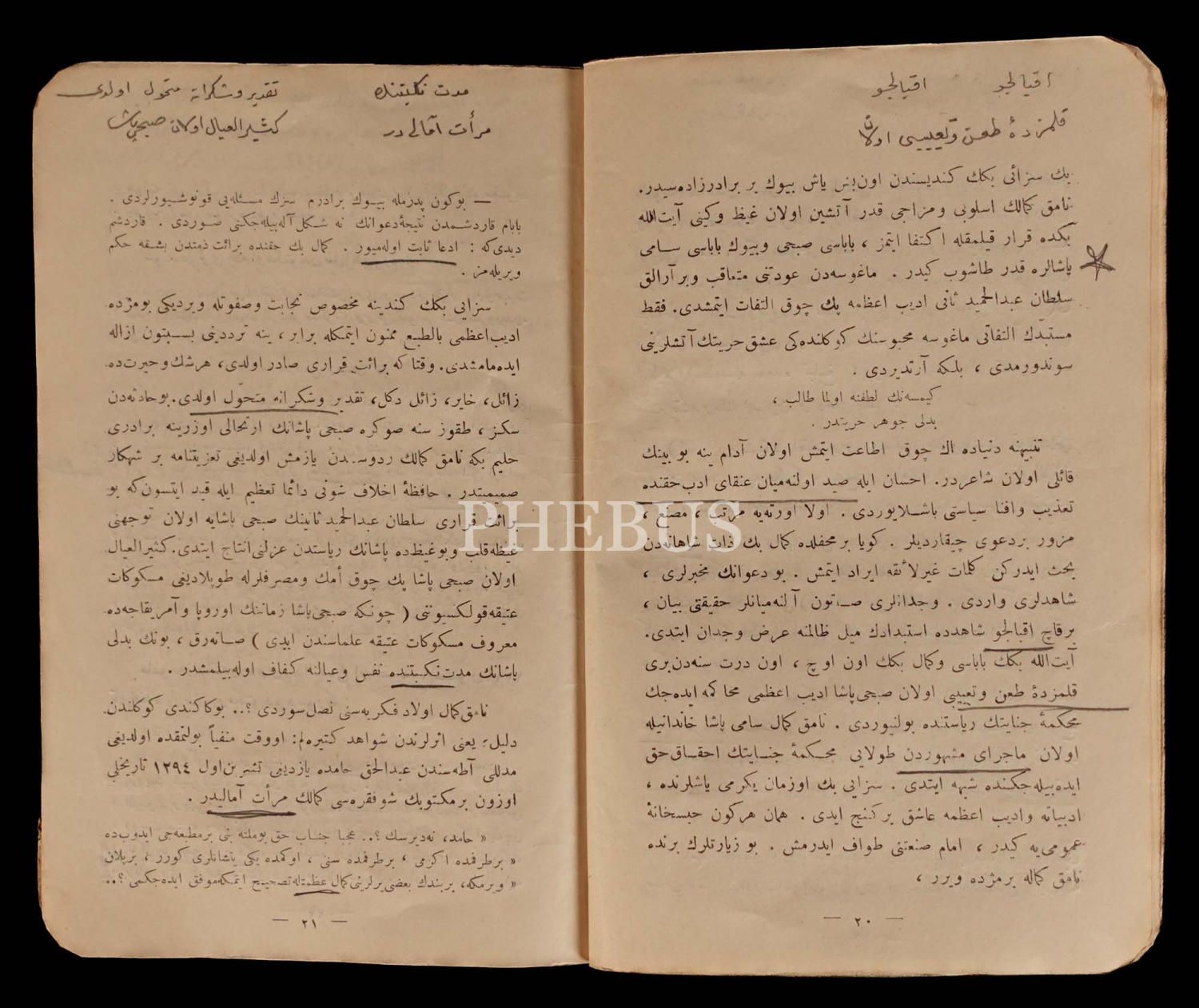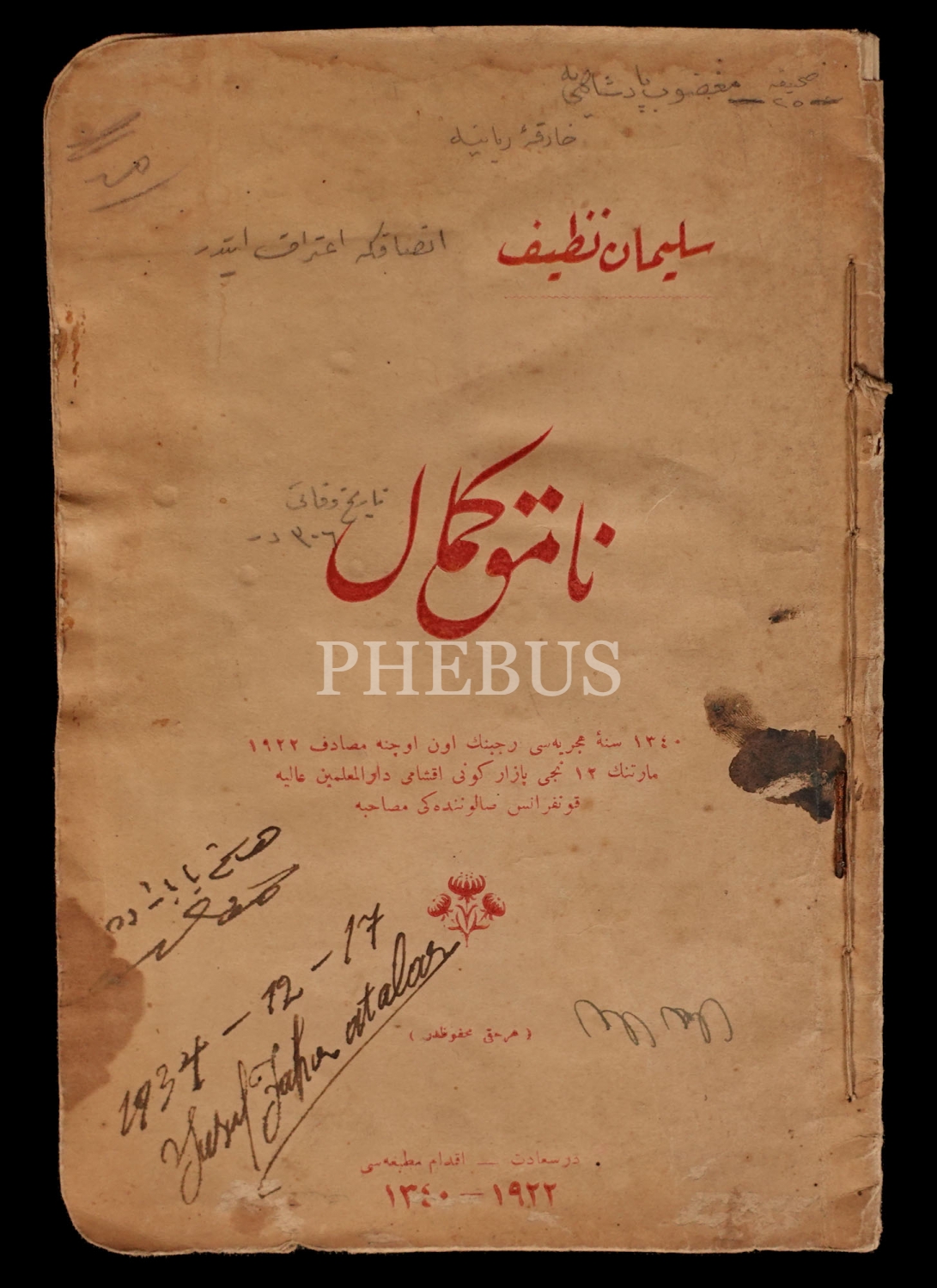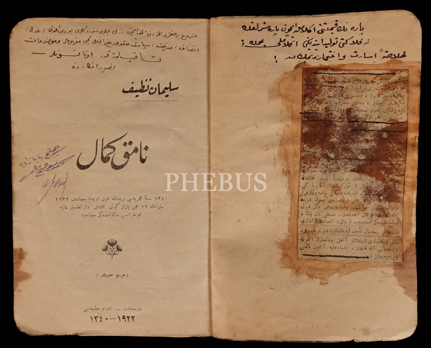 Kapağına, sayfa kenarlarına yer yer Osmanlıca notlar alınmış, ön kapak içine gazeteden kesilmiş Osmanlıca bir kupür yapıştırılmış.