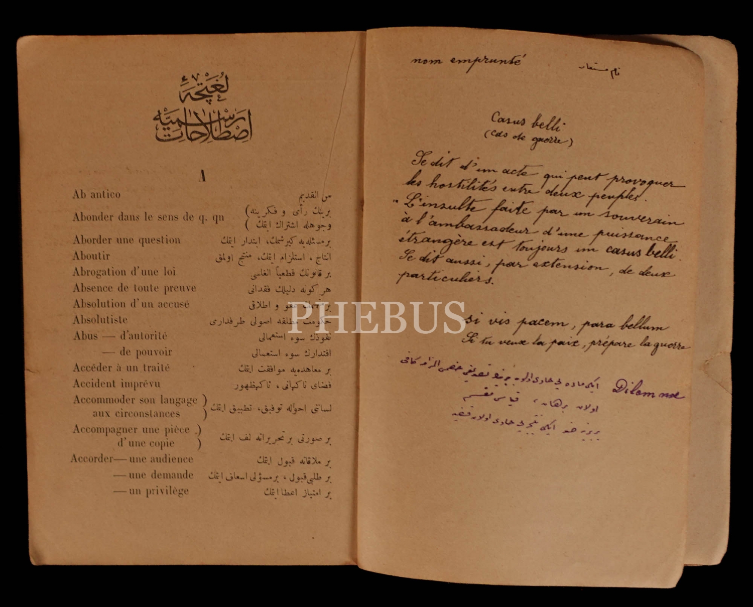 Fransızca resmi yazışmalara dair... * Ön kapağında kopukluk var, arka kapağı ayrılmış durumda, kapak içlerinde ve sayfalarda yer yer Osmanlıca - Fransızca yazılar var.