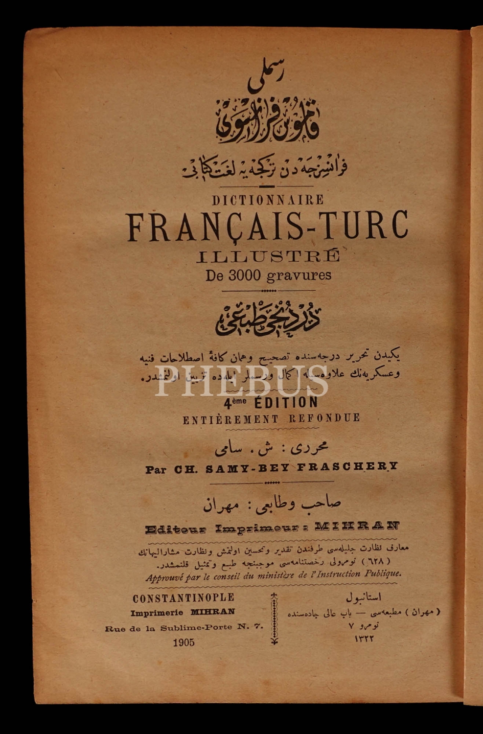 KAMUS-I FRANSEVÎ - DICTIONNARIE FRANÇAIS-TURC, Şemseddin Sami, 1905, Mihran Matbaası, 2240 sayfa, 14x20 cm...