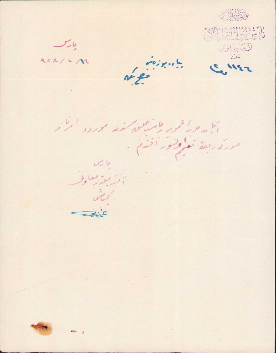 Osmanlıca Türkiye Cumhuriyeti Paris Büyükelçiliği Militerliği antetli evrak, 1928 tarihli, 16x20 cm