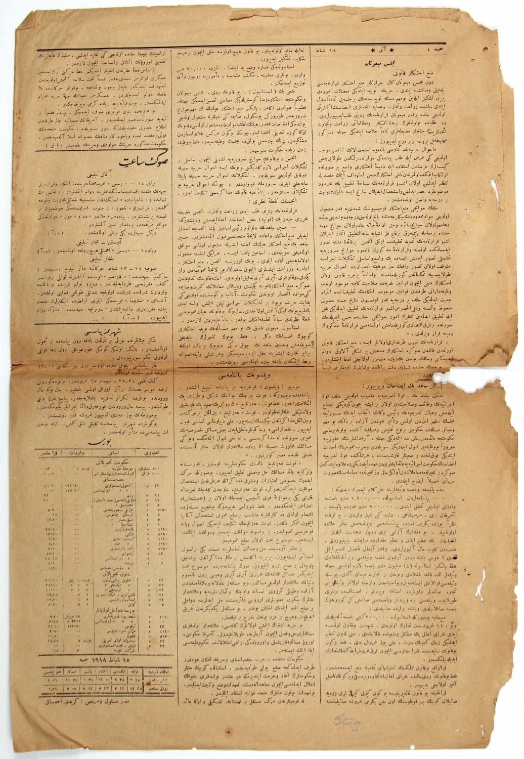Osmanlıca Ati gazetesi, 1918, manşetler: "Hariciye Nazırı Vekilimiz Sulha Dair Beyanatı / Ukrayna Muahede-i Sulhiyyesinin Metni Gazetemizde Münnderecdir / Men-i İhtikar Kararnamesi Müzakerat ve Münakaşati Bitmedi / Erzincanın Ermeni Çetelerinden Tahlisi