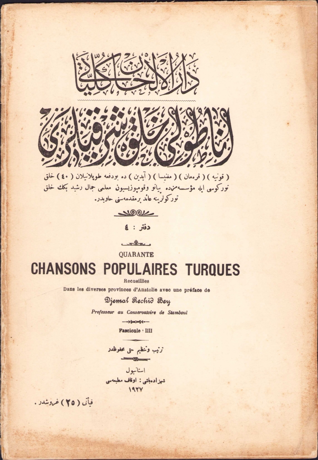 Osmanlıca nota, Darülelhan Külliyatı, Anadolu Şarkıları, defter: 4, Reşit Bey, Evkaf Matbaası, 1927, 24 sayfa, 20x28 cm