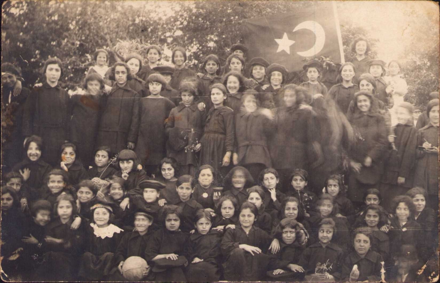 Erken dönem kız mektep öğrencileri, Türk bayraklı