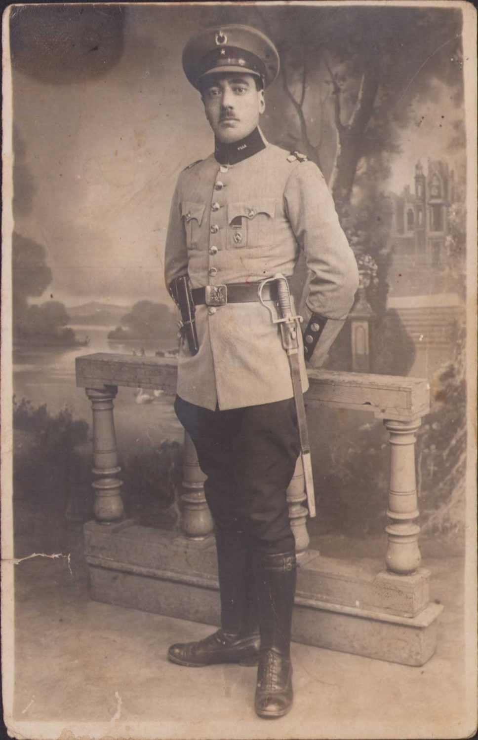Osmanlı subayı, stüdyo ortamında çekilmiş üniformalı, Osmanlı kemer tokalı madalyalı, kılıçlı, haliyle
