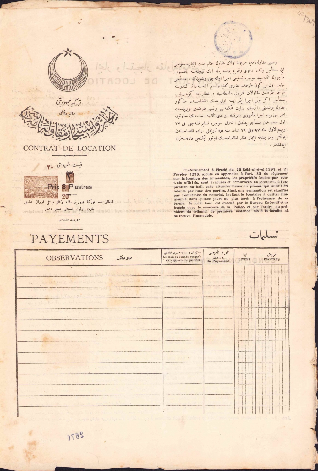 Osmanlıca kira kontratı, Kasımpaşa, 2 sayfa, 28x40 cm