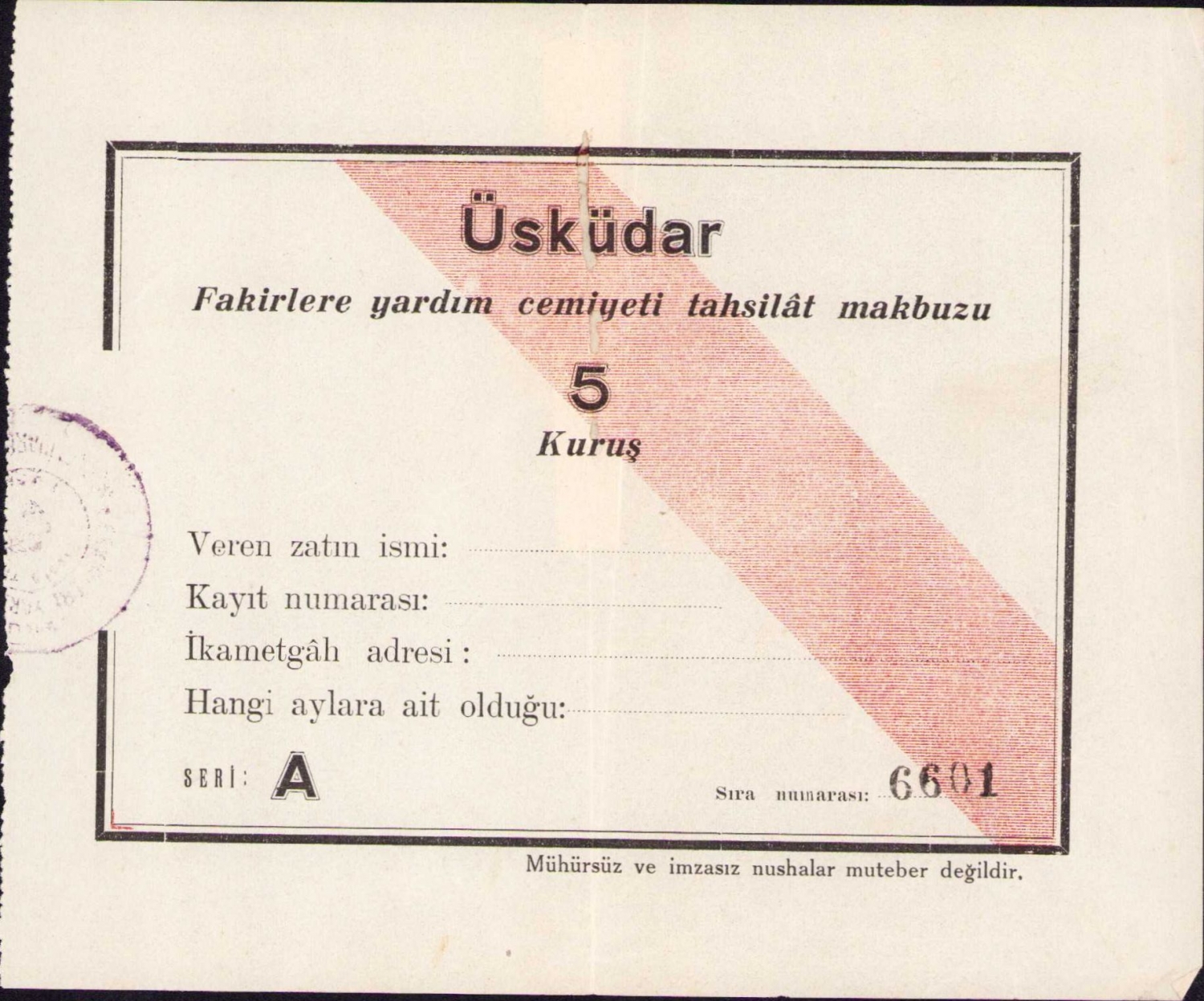 Üsküdar Fakirlere yardım cemiyeti tahsilat makbuzu, 15x13 cm