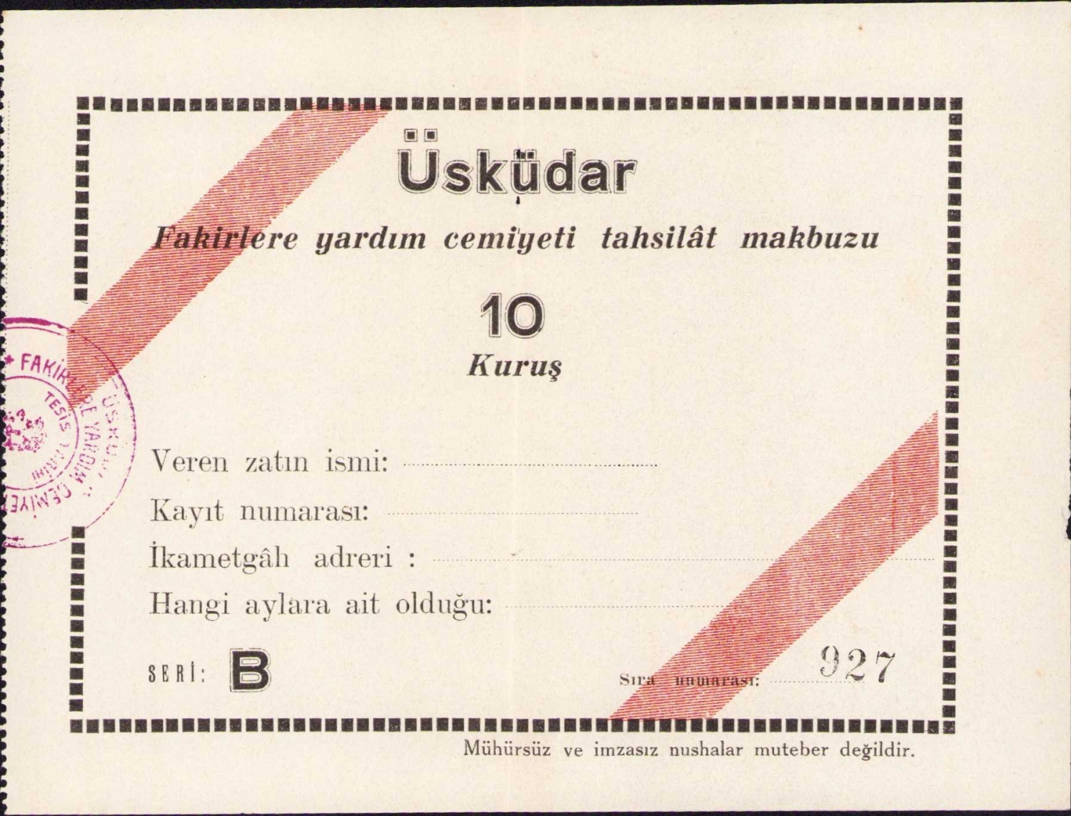 Üsküdar Fakirlere yardım cemiyeti tahsilat makbuzu, 15x13 cm