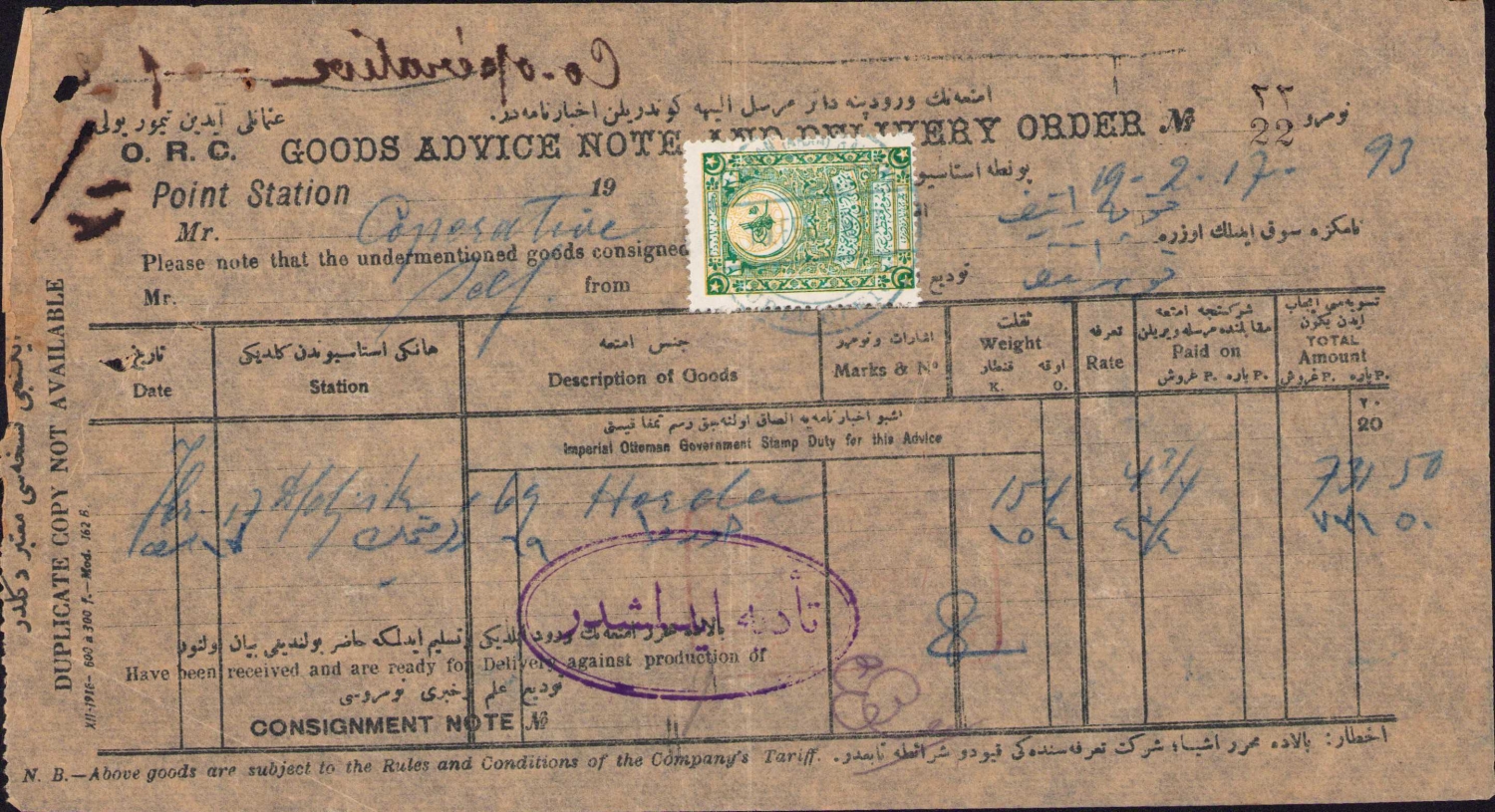 Osmanlıca - İngilizce, Aydın Demiryolu Antetli Emtianın Vüruduna Dair Gönderilen İhbarnamedir, pullu damgalı, 24x12 cm