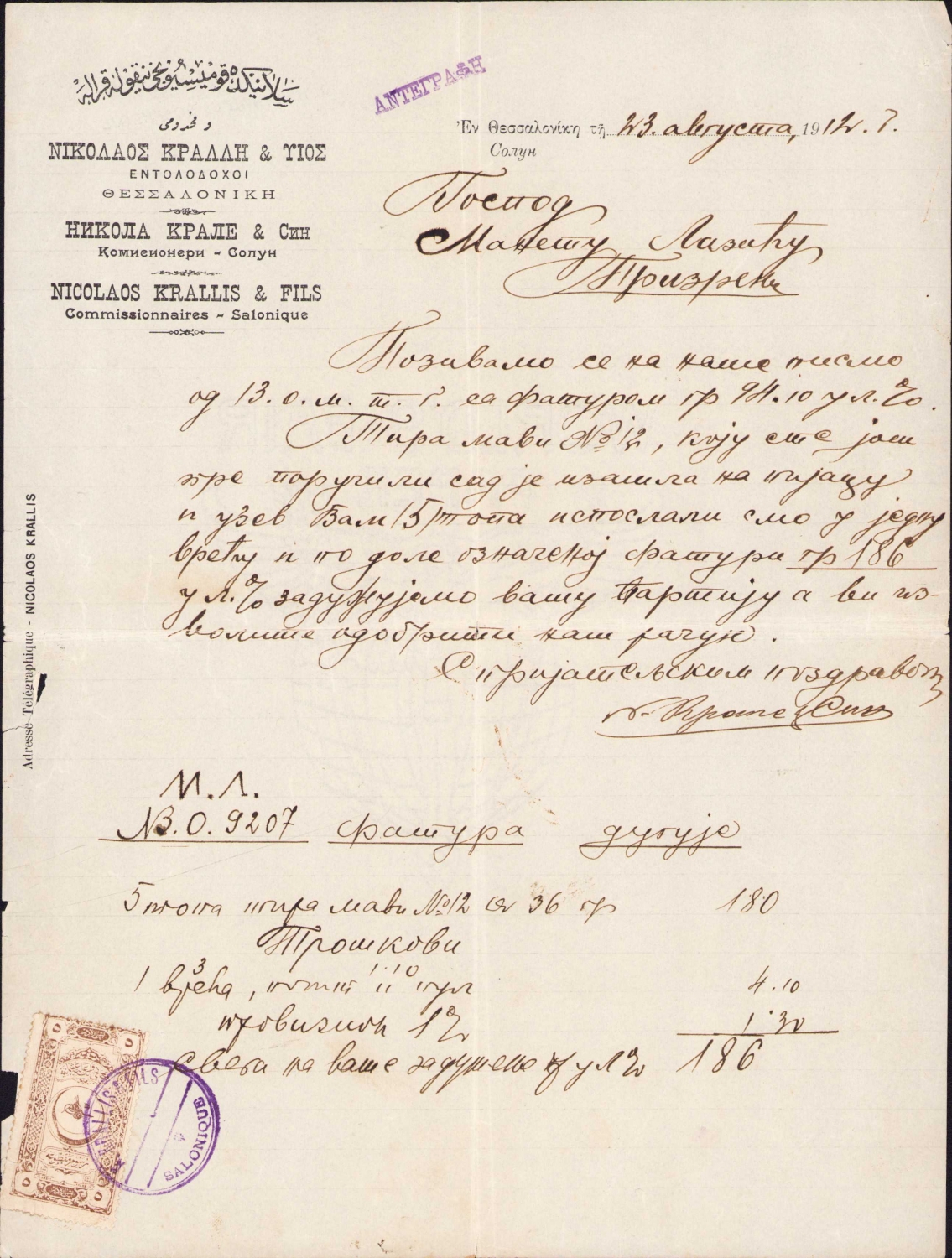 Osmanlıca - Rumca - Rusça - Fransızca Selanik'te Komisyoncu Nicolas Krallis antetli doküman, 1914 tarihli
