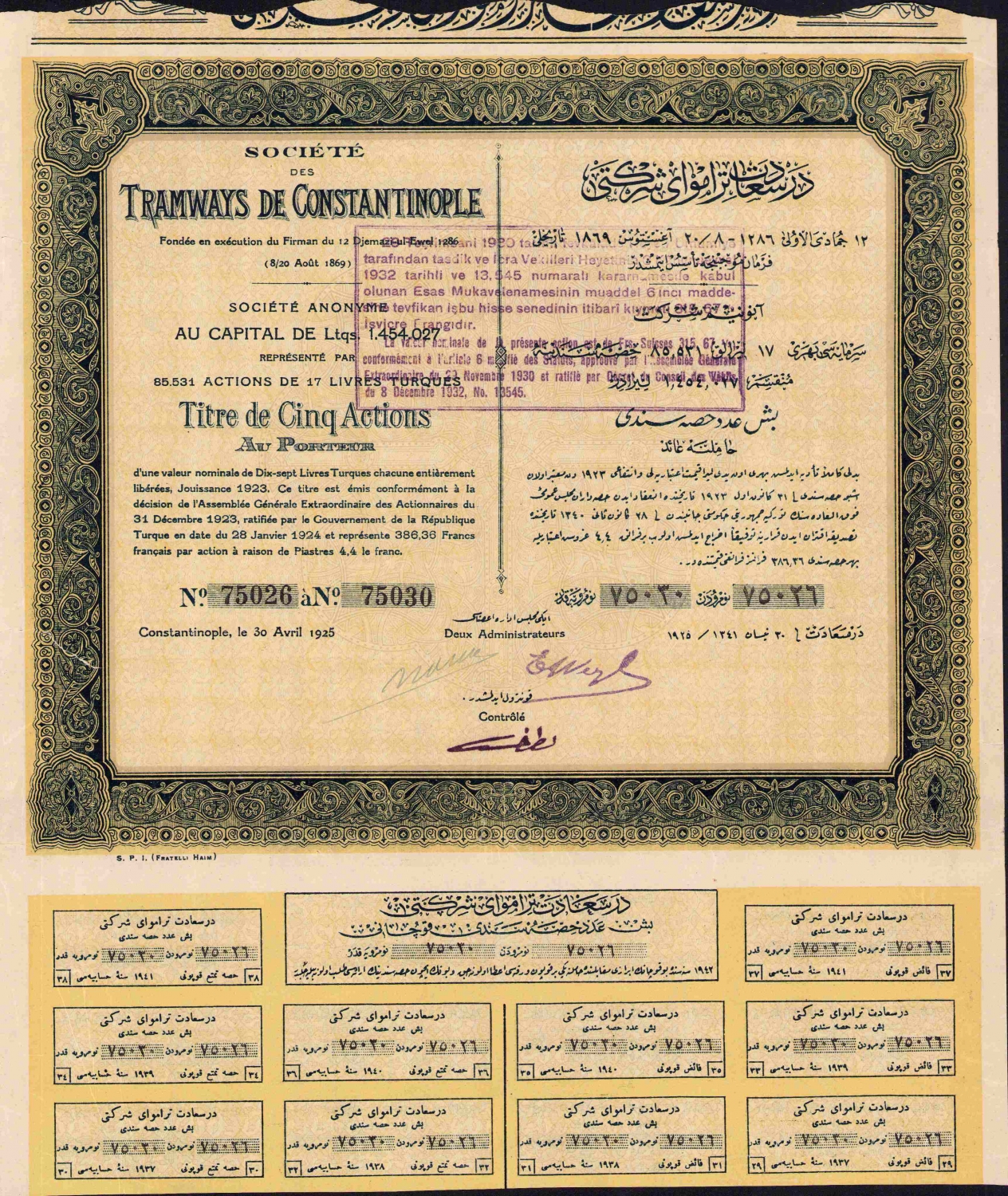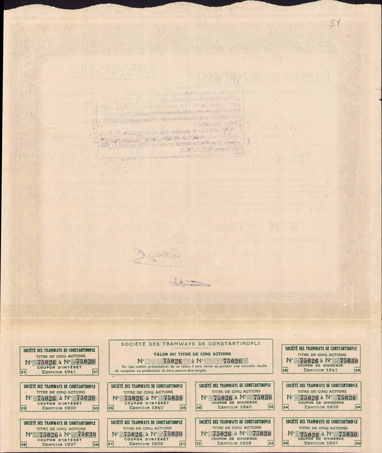 Osmanlıca - Fransızca Dersaadet Tramvay Şirketi hisse senedi, 28x34 cm