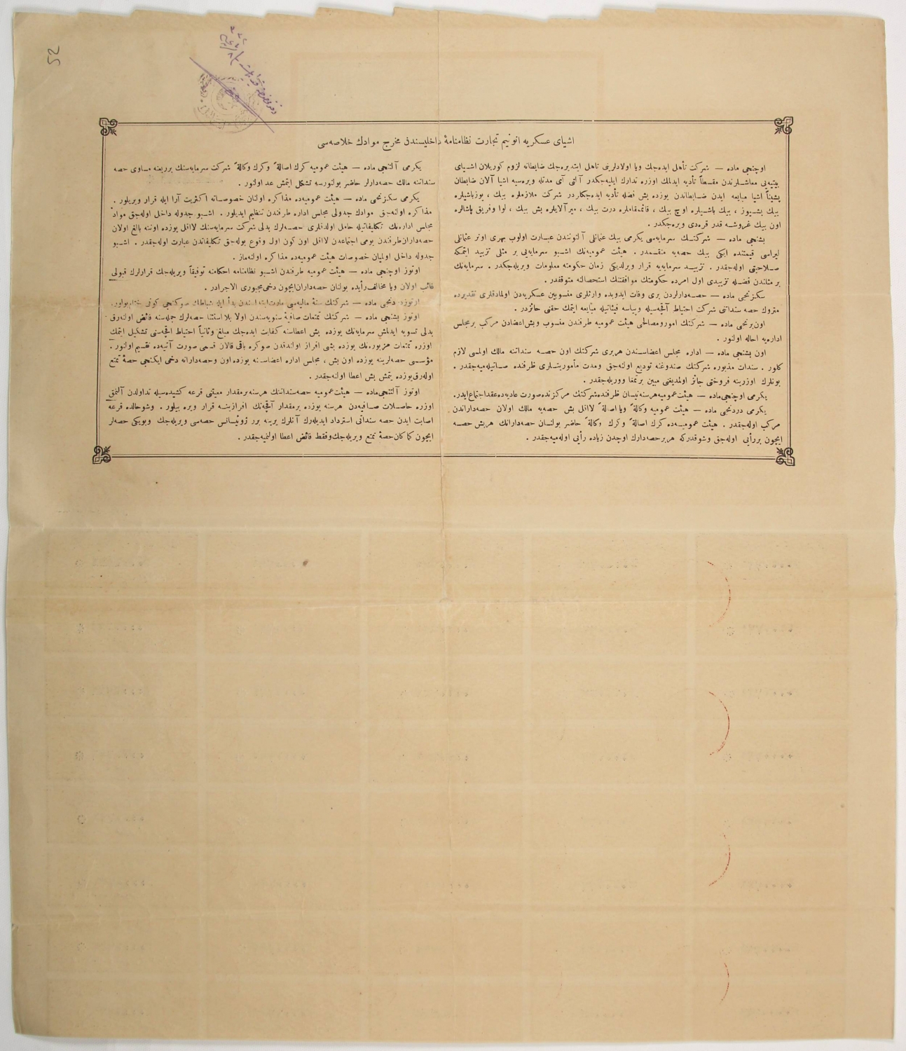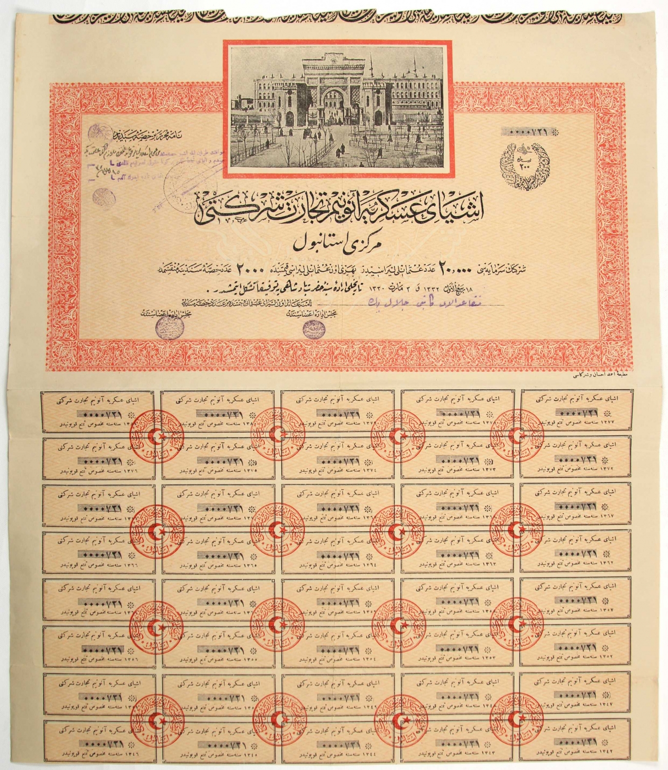 Osmanlıca Eşyayı Askeriye Anonim Ticaret Şirketi hisse senedi, 41x50 cm