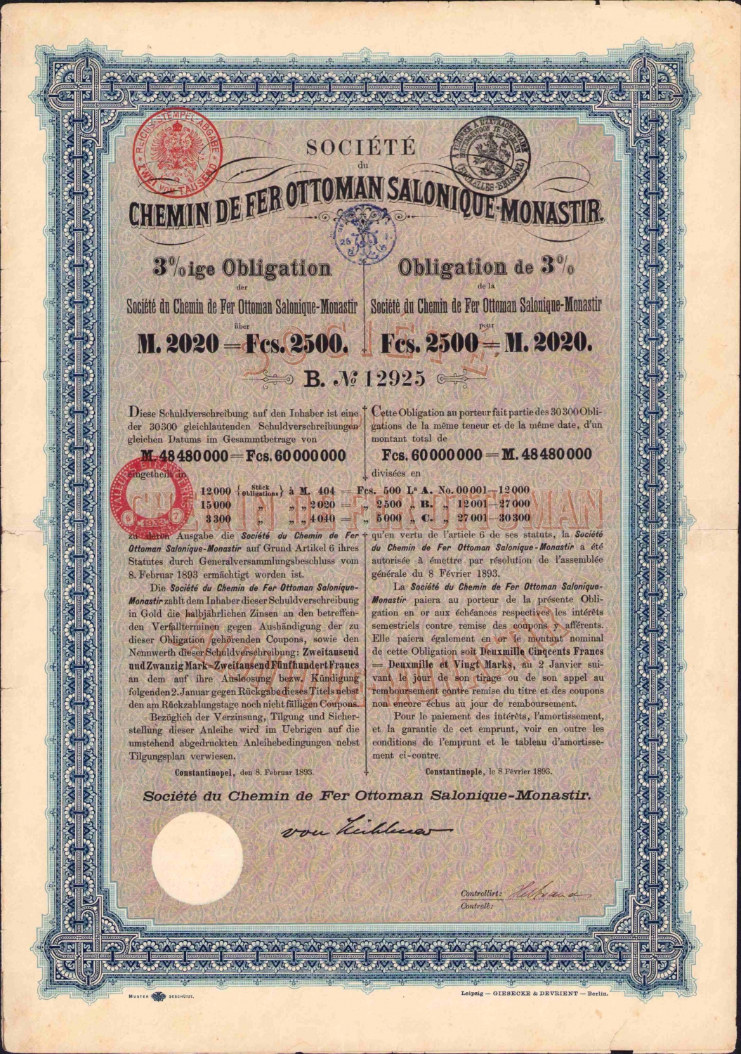 Fransızca Societe du Chemin de Fer Ottoman Salonique - Monastir senet, 4 sayfa, 25x35 cm