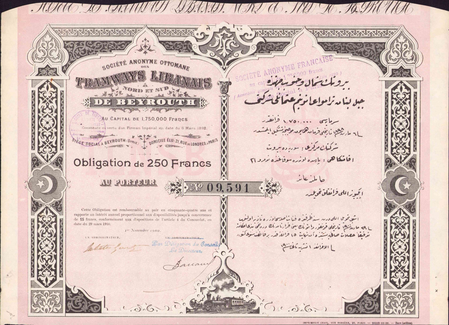 Osmanlıca - Fransızca 1900 Beyrut Lübnan Tramvayları Osmanlı A.Ş., 250 Frank hisse senedi, 30x23 cm